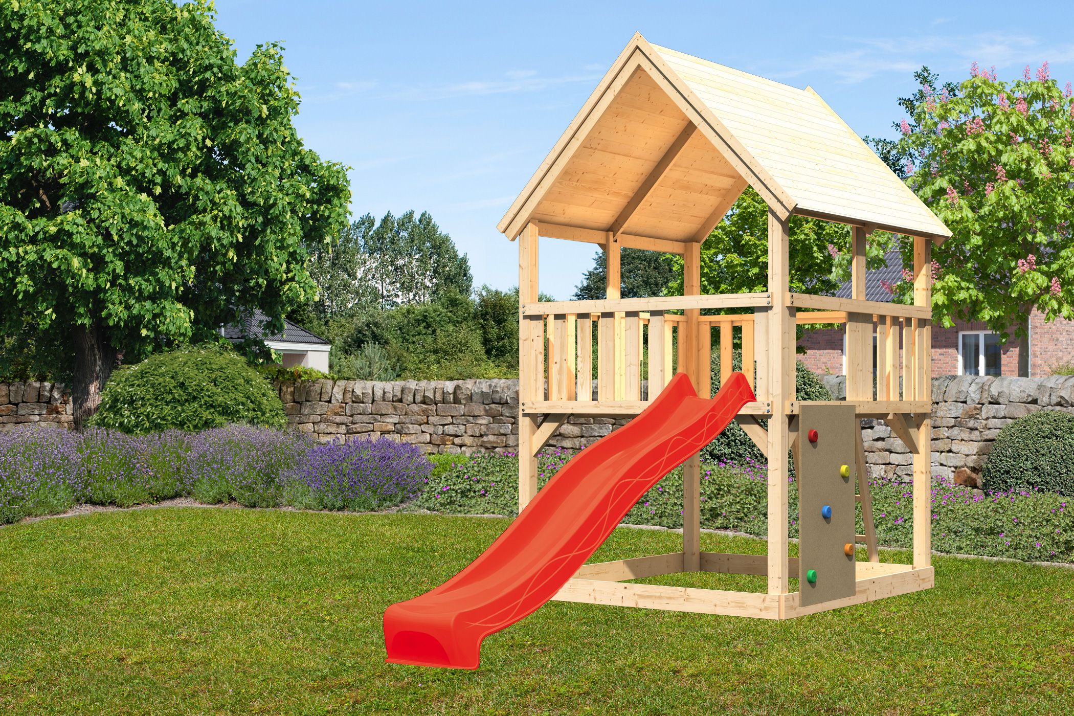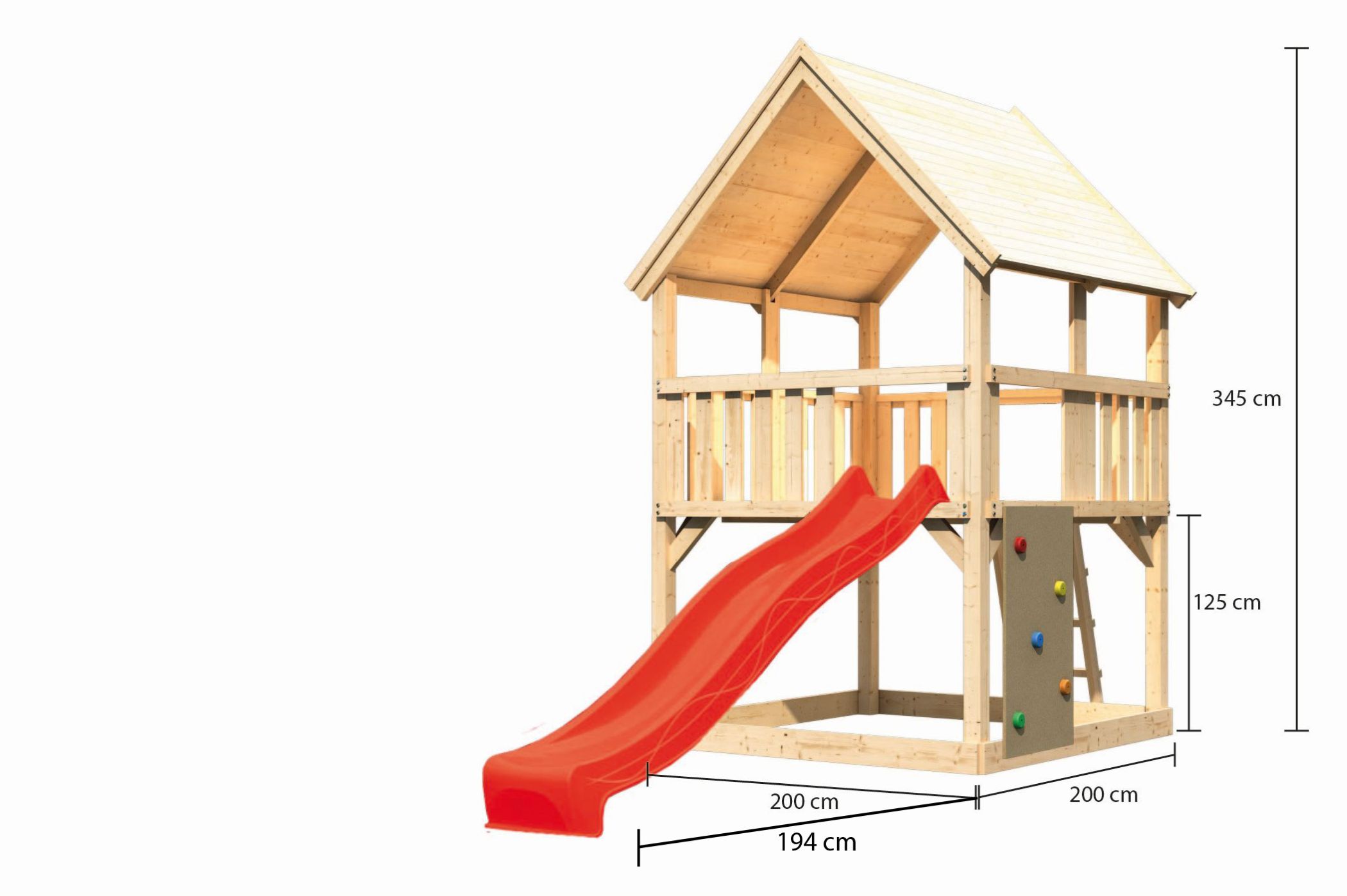 Unser Spielturm Luis von Akubi & Karibu steht wortwörtlich über den Dingen. Mit den 90 x 90 mm starken Pfosten und einer Firsthöhe von 345 cm ist er über jeden Zweifel erhaben. Die Rohware für unseren Luis kommt wie bei allen anderen Spieltürmen auch aus dem hohen Norden Europas. Durch die dort vorherrschenden harten Winter wächst das Holz langsamer, die Jahresringe stehen enger zusammen und das Holz wird härter. Dadurch, dass wir unsere Spieltürme naturbelassen an Sie ausliefern, können wir sicher sein, dass sich keinerlei bekannte problematische Substanzen im Holz befinden.