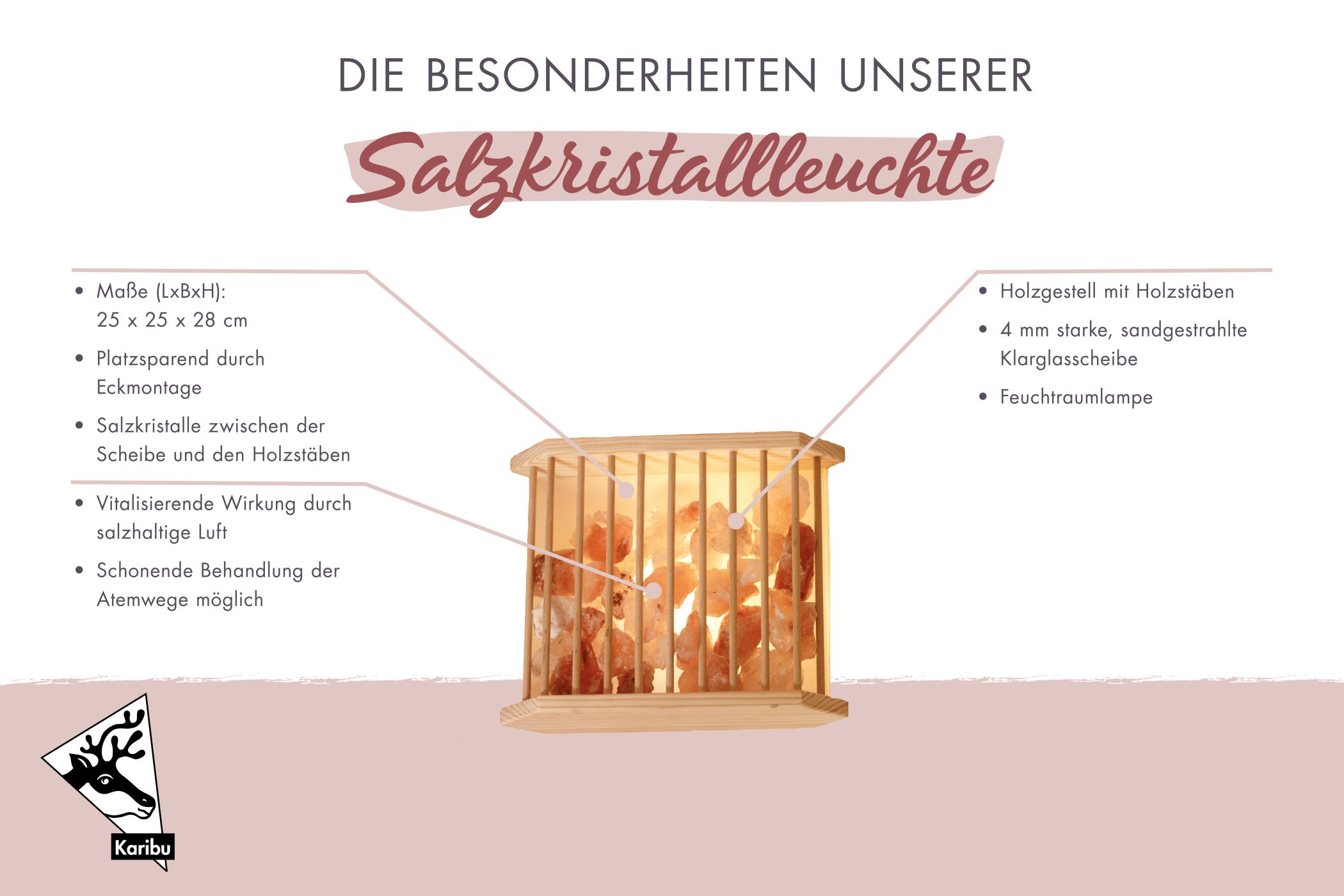 Holen Sie sich die salzige Seeluft in Ihre Sauna und schaffen Sie sich ein schönes Ambiente mit der Salzkristall-Leuchte. Die Leuchte besteht aus einem Holzgestell mit Holzstäbchen, einer 4mm starken, sandgestrahlten Klarglasschreibe und einer Feuchtraumlampe. Für die perfekte Luft in der Sauna werden die Salzkristalle zwischen die Klarglasscheibe und die Holzstäbchen gelegt. Durch den aufsteigenden Wasserdampf in der Sauna werden die wertvollen Mineralien aus dem Kristall gespült und bereichern die Luft. Vor allem Allergiker und Asthmatiker können von der positiven Wirkung profitieren. Die Salzkristall-Leuchte hat eine Größe von (LxBxH) 25x25x28cm und ist für die Eckmontage geeignet. Lehnen Sie sich in Ihrer Sauna zurück, schließen Sie die Augen und Atmen Sie die gesunde, salzhaltige Luft ein. Träumen Sie sich ans Meer in Ihrer Sauna mit der Salzkristall-Leuchte für das perfekte Ambiente.