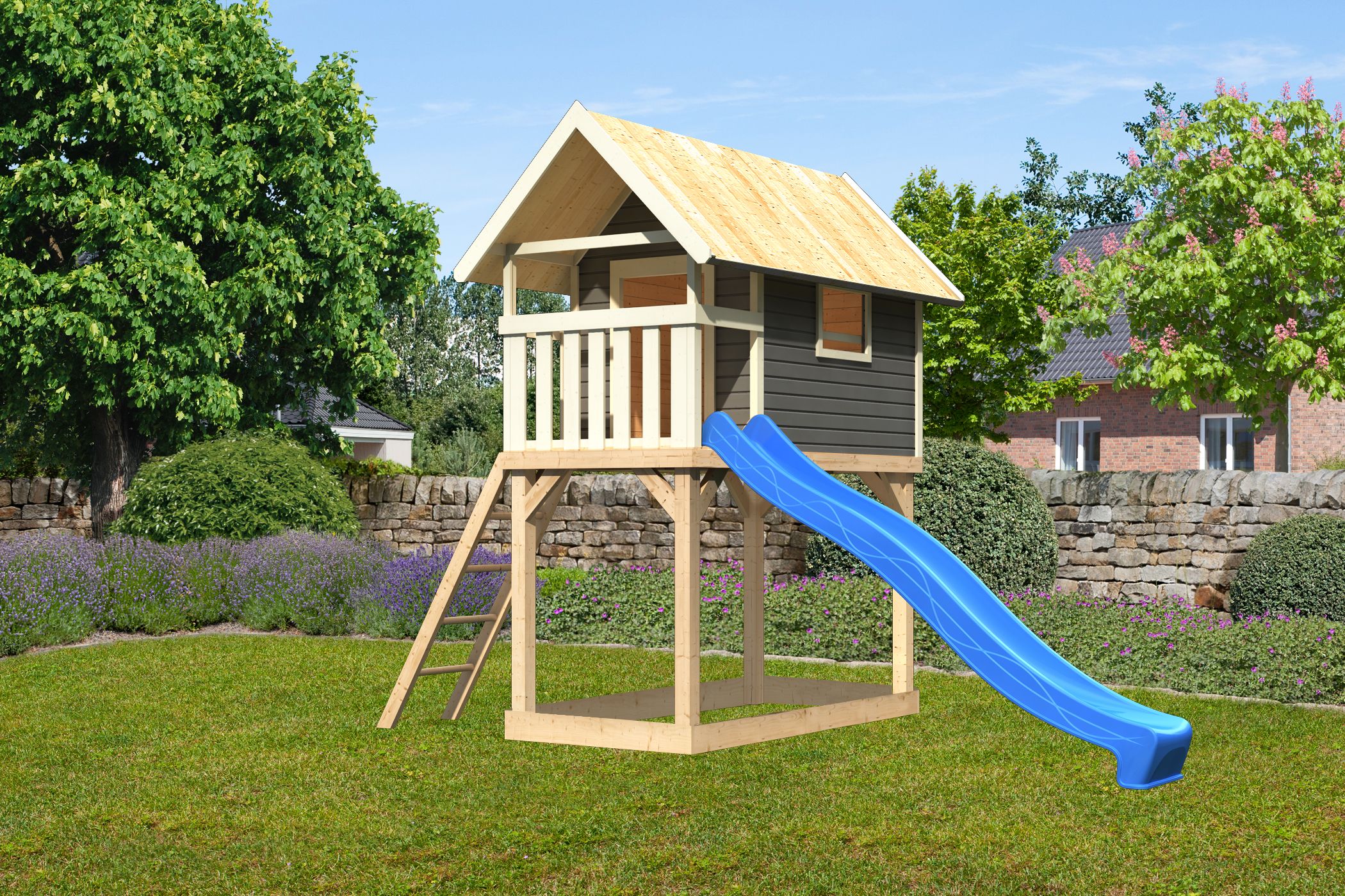 Unser Stelzenhaus Gernegroß lässt sich ganz individuell zusammenstellen. Mit Holz- oder Netzrampe? Dazu noch eine 300 cm lange Rutsche? Eine rote oder blaue? Entdecke unsere vielseitigen Möglichkeiten und zaubere dir einen echten Hingucker in den Garten.