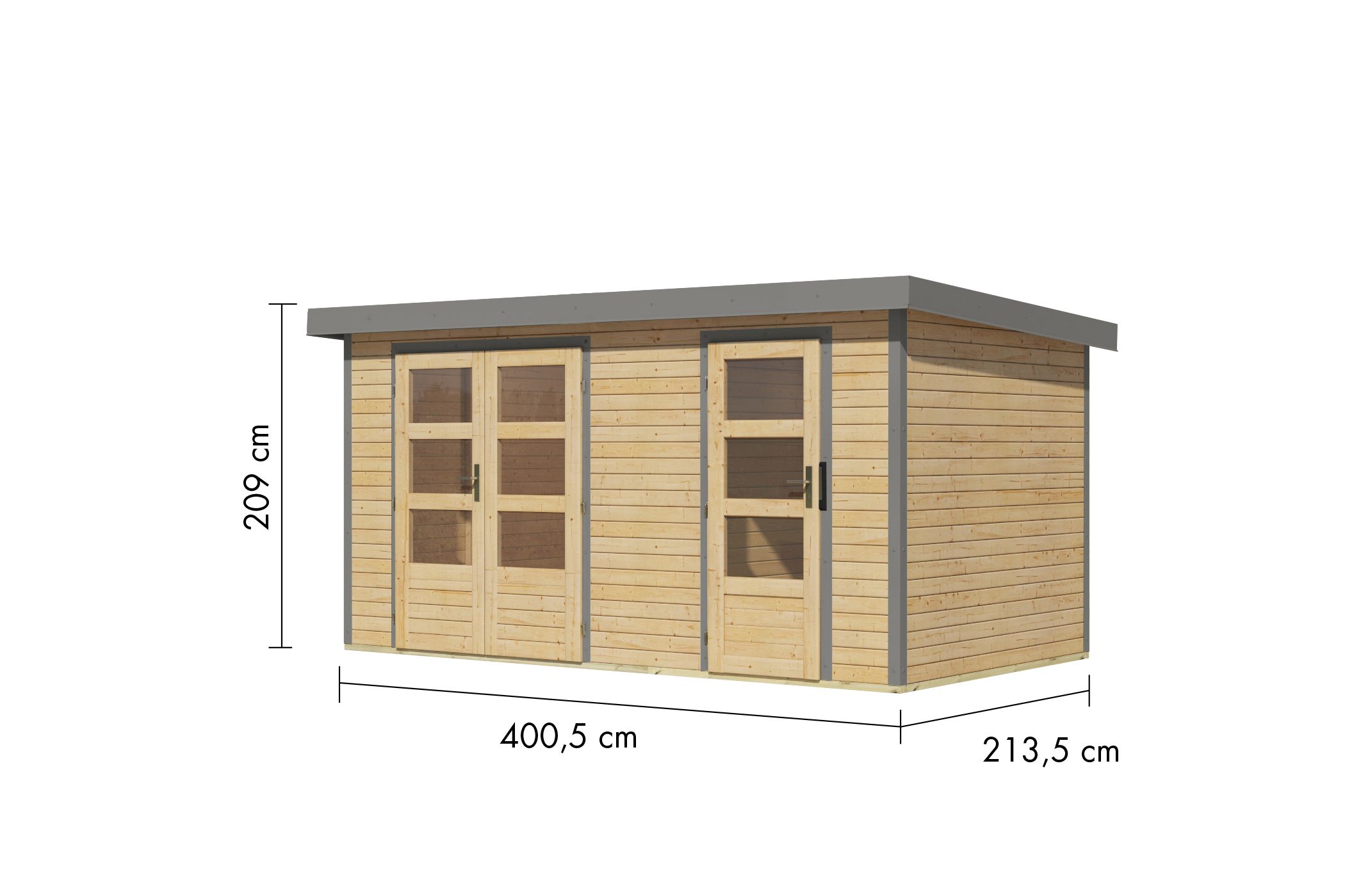 - High-quality materials such as Nordic spruce, steel corners and trapezoidal sheet metal roofing