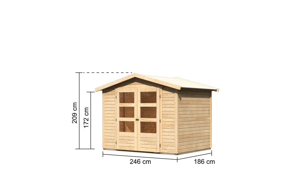 Ein klassisches Gartenhaus - unter diesem Motto lässt sich das Gartenhaus Amberg 3 zusammenfassen. Das Satteldachhaus besteht aus 19 mm starker, nordischer Fichte im klassischen Steck- und Schraubsystem. Dieses ermöglicht einen einfachen und schnellen Aufbau, wofür kein großes handwerkliches Geschick erforderlich ist. Das Satteldach mit einer Dachfläche von 5,8 m² macht aus dem Gartenhaus einen echten Klassiker und ein Muss für Ihren Garten. Das Gartenhaus ist in der Farbe Terragrau und in Naturbelassen erhältlich, lässt sich ganz individuell gestalten und lässt sich so optimal Ihren Wünschen und Bedürfnissen anpassen. Die Doppelflügeltür mit drei Lichtausschnitten pro Türflügel rundet das Äußere des Gartenhauses ab und lässt Tageslicht hinein. Geschützt vor unbefugten Eindringen wird das Gartenhaus mit einer Sicherheitsüberfalle. Auch der Innenraum bietet viele Gestaltungsmöglichkeiten. Mit einem Innenmaß von (BxT) 238 x 178 cm eignet es sich ideal für eine gemütliche Sitzlounge, die zum Entspannen im eigenen Garten einlädt. Durch die klassische Optik des Gartenhauses fügt es sich in das Gesamtbild des Gartens optimal ein. Runden Sie Ihr Gartenhaus mit dem passenden Zubehör ab. Durch eine Holzdachrinne, Dachschindeln als Dachbedeckung oder den passenden Fußboden verleihen Sie Ihrem Gartenhaus den letzten Schliff. Erweitern Sie die Möglichkeiten im eigenen Garten mit dem Gartenhaus Amberg 3.