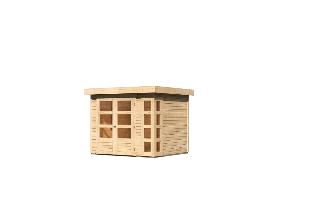 Heller Innenraum durch moderne Fensterecke - das Gartenhaus Kerko 3 sorgt so für ein optisches Highlight in Ihrem Garten. Das 19 mm Flachdachhaus aus nordischer Fichte mit einer Firsthöhe von 211 cm wird durch das Plugging and screwing system quick and easy installation.