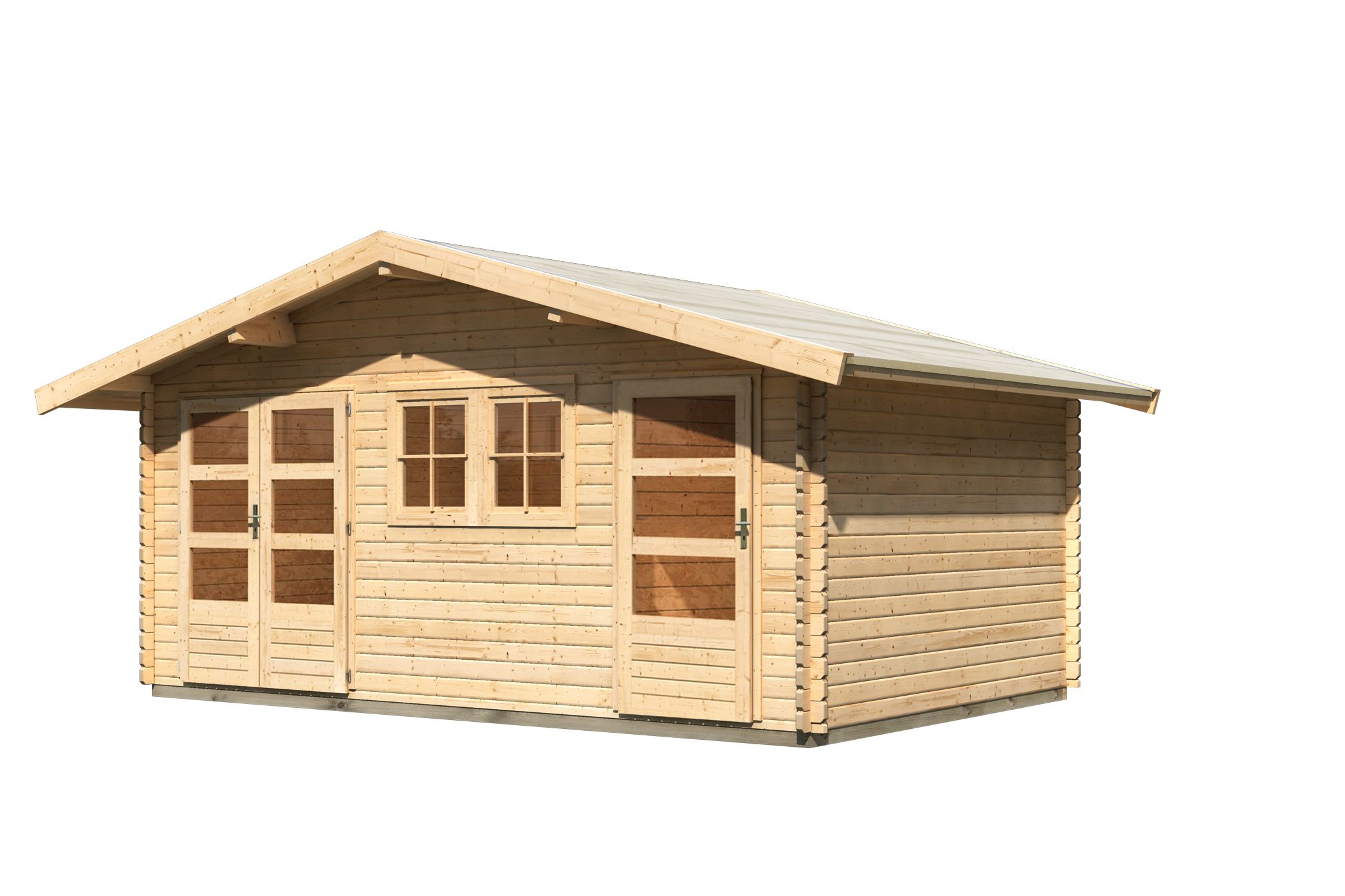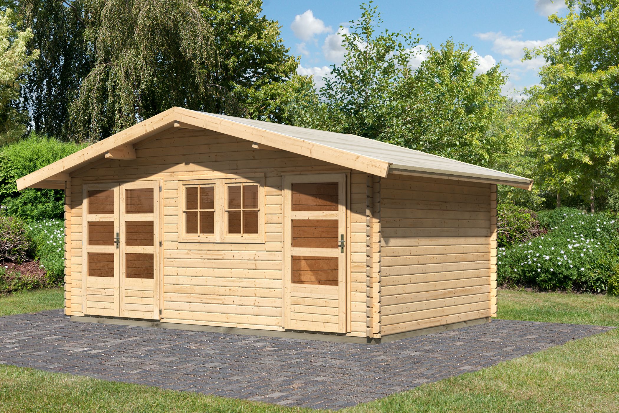 Blauer Himmel, Sonnenschein, die Blumen fangen an zu blühen, es wird wärmer. Dies sind erste Anzeichen für die ideale Jahreszeit seinen Garten mal wieder auf Vordermann zu bringen. Doch wohin mit den Gartengeräten nach getaner Arbeit? Und eigentlich brauchen Sie auch noch einen gemütlichen, geschützten Ort zum Entspannen und genießen? Mit dem Gartenhaus Lagor 2 können Sie sich beide Wünsche mit einem Haus erfüllen. Durch eine 28 mm Mittelwand entstehen aus einem Raum zwei und das in einem Haus. So können Sie den kleinen Raum nutzen um Ihre Gartengeräte zu lagern und den großen Raum gemütlich und heimisch einrichten. Gestalten Sie das Gartenhaus ganz nach Ihren Wünschen und Bedürfnissen. Vielleicht benötigen Sie auch einen zusätzlichen Raum für Ihre Fahrräder oder für das Spielzeug Ihrer Kleinen. All das und noch viel mehr ermöglicht Ihnen das Gartenhaus Lagor. Durch die beiden im Lieferumfang enthaltenen Fenster gelangt viel Tageslicht ins Innere und bietet so eine natürliche Lichtquelle. Mit einem Außenmaß von (BxT) 507 x 327 cm haben Sie ausreichend Platz um Ordnung zu schaffen. Eine Doppelflügeltür und eine Einflügeltür mit drei Lichtausschnitten pro Türflügel und einem Zylinderschloss je Tür schützen die Räume vor unbefugtem Betreten. Die beiden Türen sind in der Front variabel und können in Ihrer Position getauscht werden. Das Gable roof and the Classic log construction mit patentierter 6-Plus-Eckverbindung fügen sich perfekt in Ihr Gartenambiente ein. Machen Sie Ihren Garten noch schöner und schaffen Sie Platz für Ihre Geräte mit dem Mittelwandhaus Lagor 2.