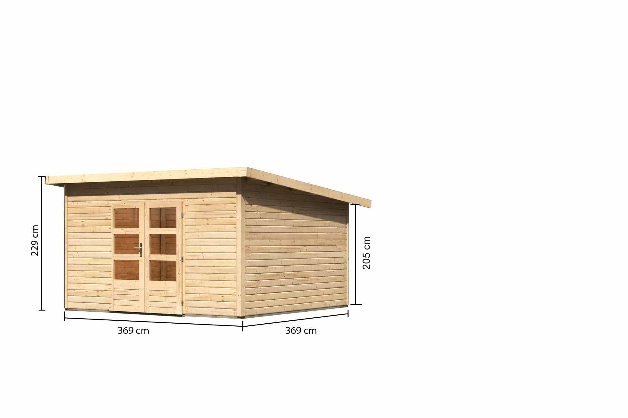 A stable monopitch roof house with many possibilities. The Northeim 5 garden house consists of 38 mm solid wood planks with double tongue and groove. The house made of Nordic spruce is available in natural or in the modern colour terra grey. The strength of the planks makes the garden house more stable and thus serves as an ideal second small home in your own garden. Due to the many different sizes in which the Northeim is available, it fits into almost any garden. Thanks to the double hinged door with three light cutouts per door leaf and cylinder lock, daylight enters the interior and provides a natural source of light. For even more brightness in the (WxD) 357 x 357 cm interior, for example, two optionally available elongated, fixed windows can be mounted next to the door. This visually opens up the front of the house and allows a wide view of your garden from the inside. The outdoor area of the Northeim 5 garden house can be extended by an extension roof and thus offers even more space. This can be used sensibly as a shelter for garden tools or serve as protection from the rain for a cosy seating area. The garden house Northeim 5 - the stable monopitch roof house with many possibilities for your garden.