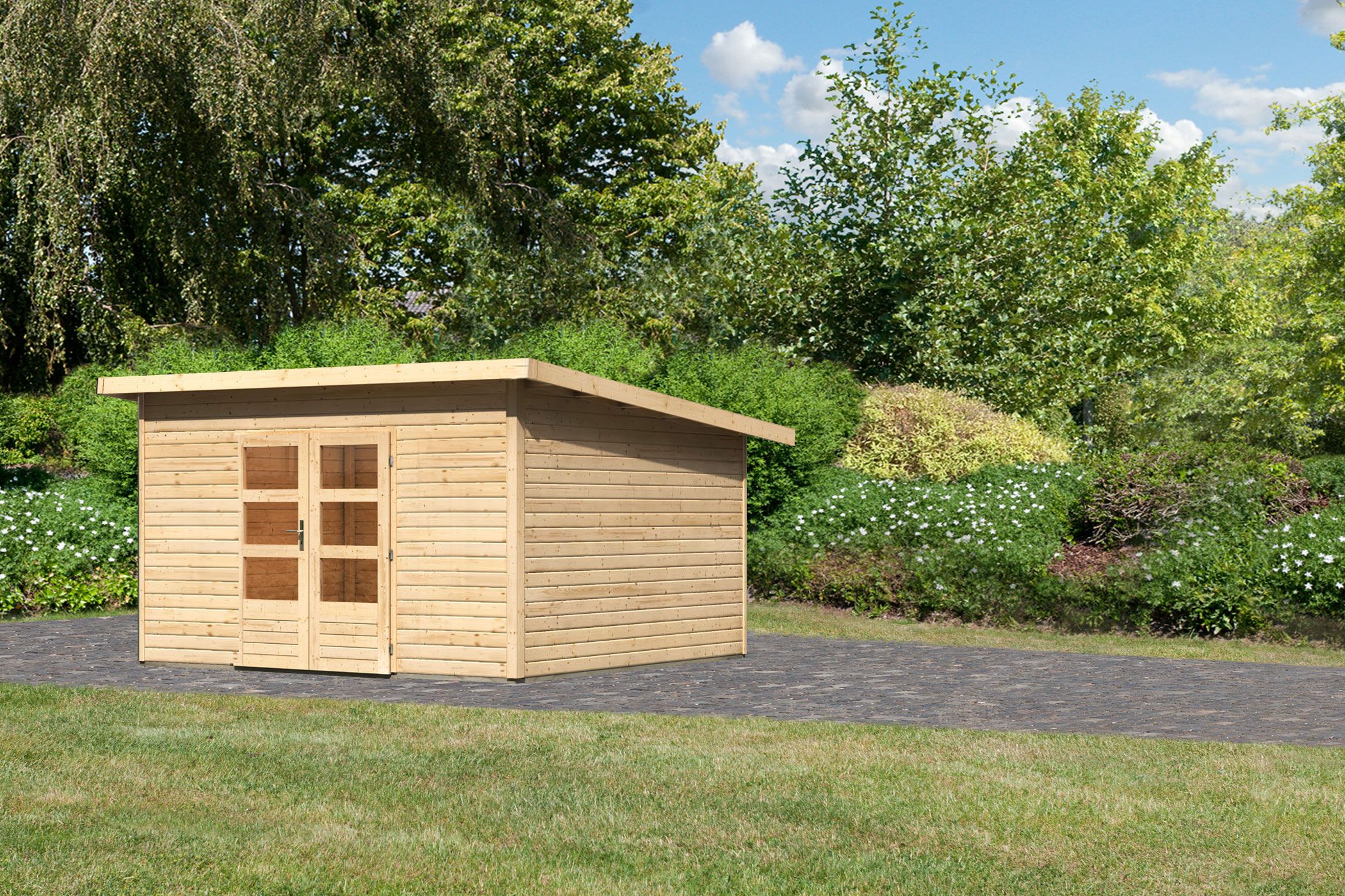 Karibu large garden house "Northeim 5" monopitch roof for living modern made of wood in nature