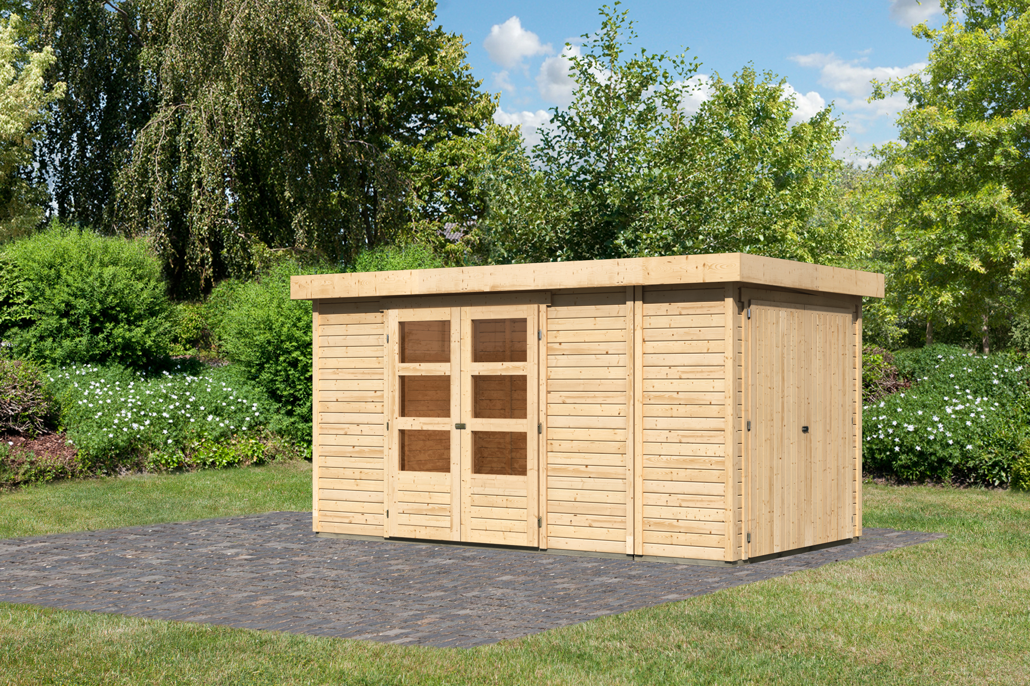 Karibu großes Gerätehaus “Retola 5” Flachdach modern aus Holz in Natur