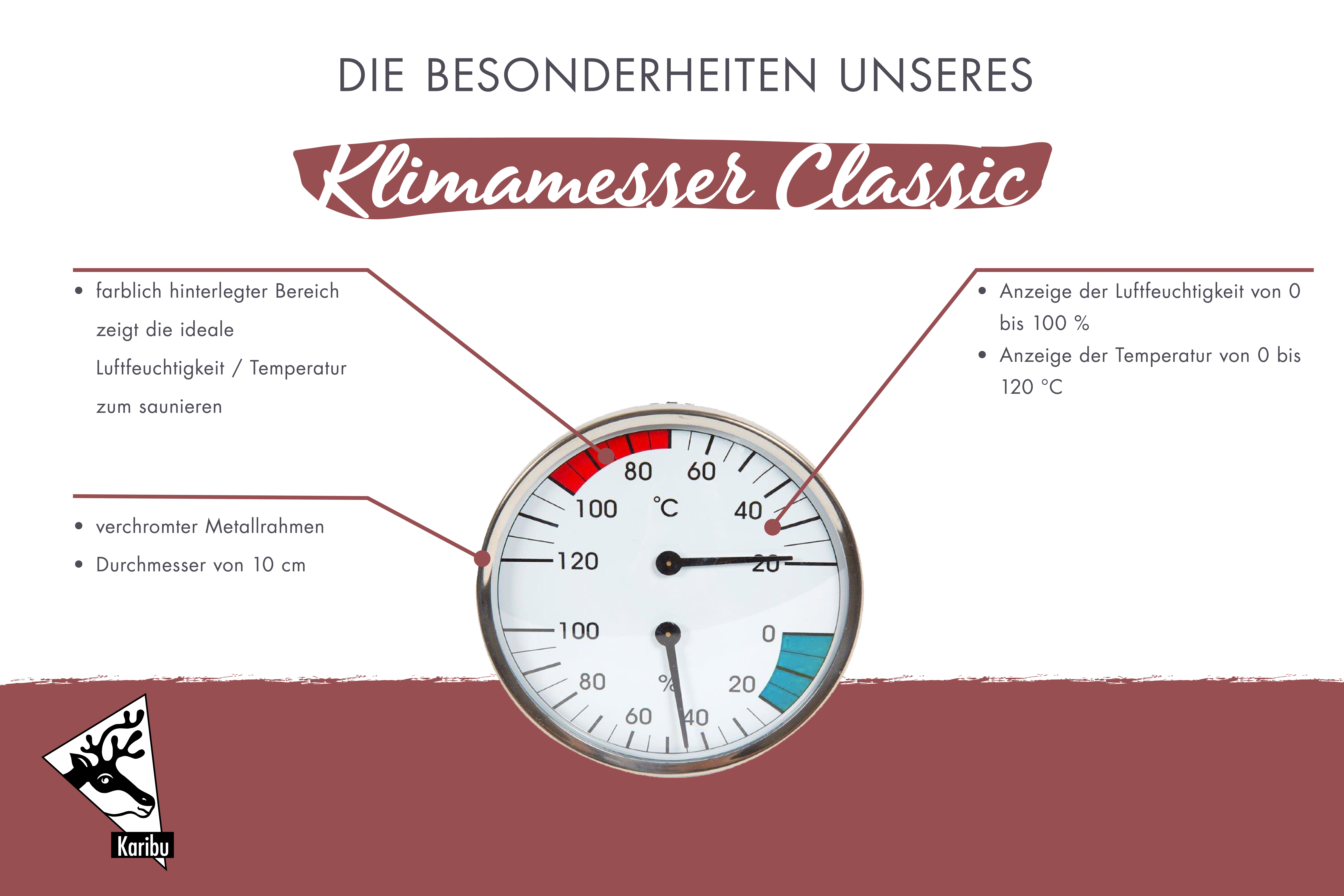 Der Klimamesser Classic zeigt Ihnen während des Saunierens sowohl die Temperatur als auch die Luftfeuchtigkeit an. So können Sie diesen Parameter überwachen und das Klima in der Sauna Ihren Wünschen anpassen. Das Messgerät hat einen Durchmesser von 10 cm und ist in einem Metallgehäuse mit verchromtem Rahmen eingefasst. Das Thermometer zeigt eine Temperatur von 0 bis 120°C an. Der farbig hinterlegte Bereich auf dem Messgerät zeigt Ihnen die perfekte Temperatur zum Saunieren an. So können Sie sich während dem Saunagang orientieren. Nutzen Sie die Vorteile und lassen Sie sich während des Saunierens leiten von dem Thermometer Classic.