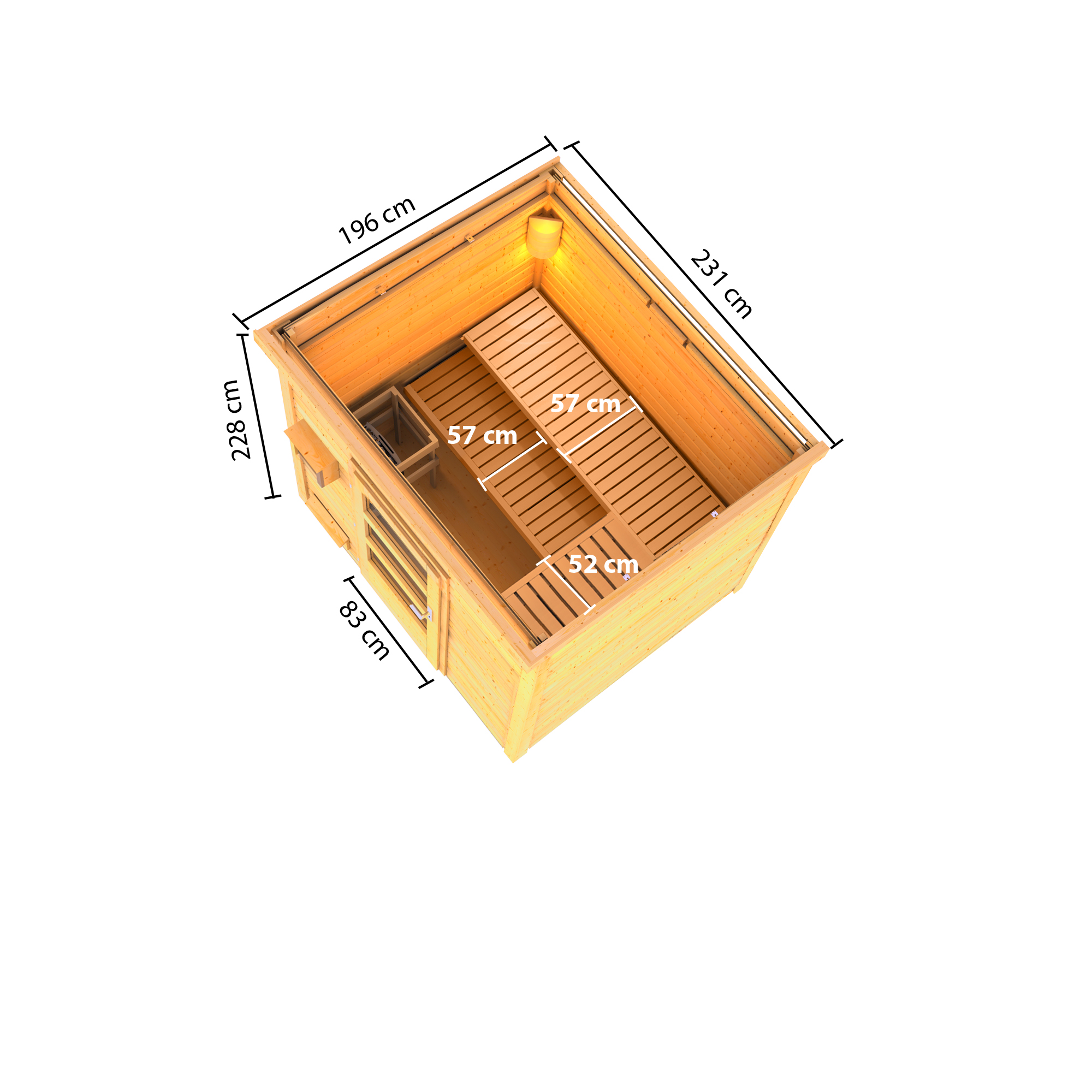 Den Tag mit einem entspannten Saunagang ausklingen lassen mit einer eigenen Außensauna. Wahlweise mit Anbaudach hat die Sauna ein Außenmaß von 231x196 cm. Drei Bänke bieten Platz zum gemeinsamen Sitzen oder Liegen in der heimischen Sauna.