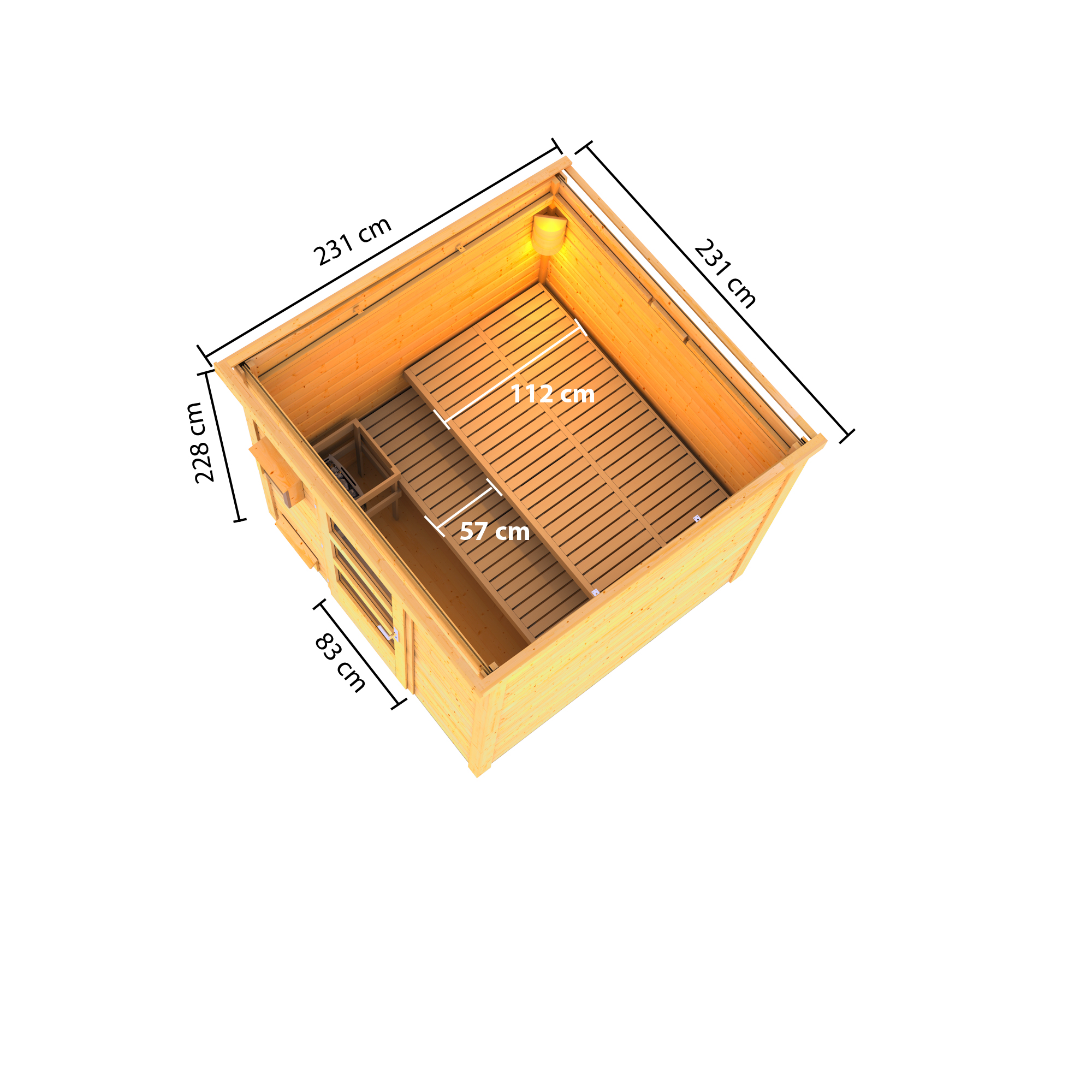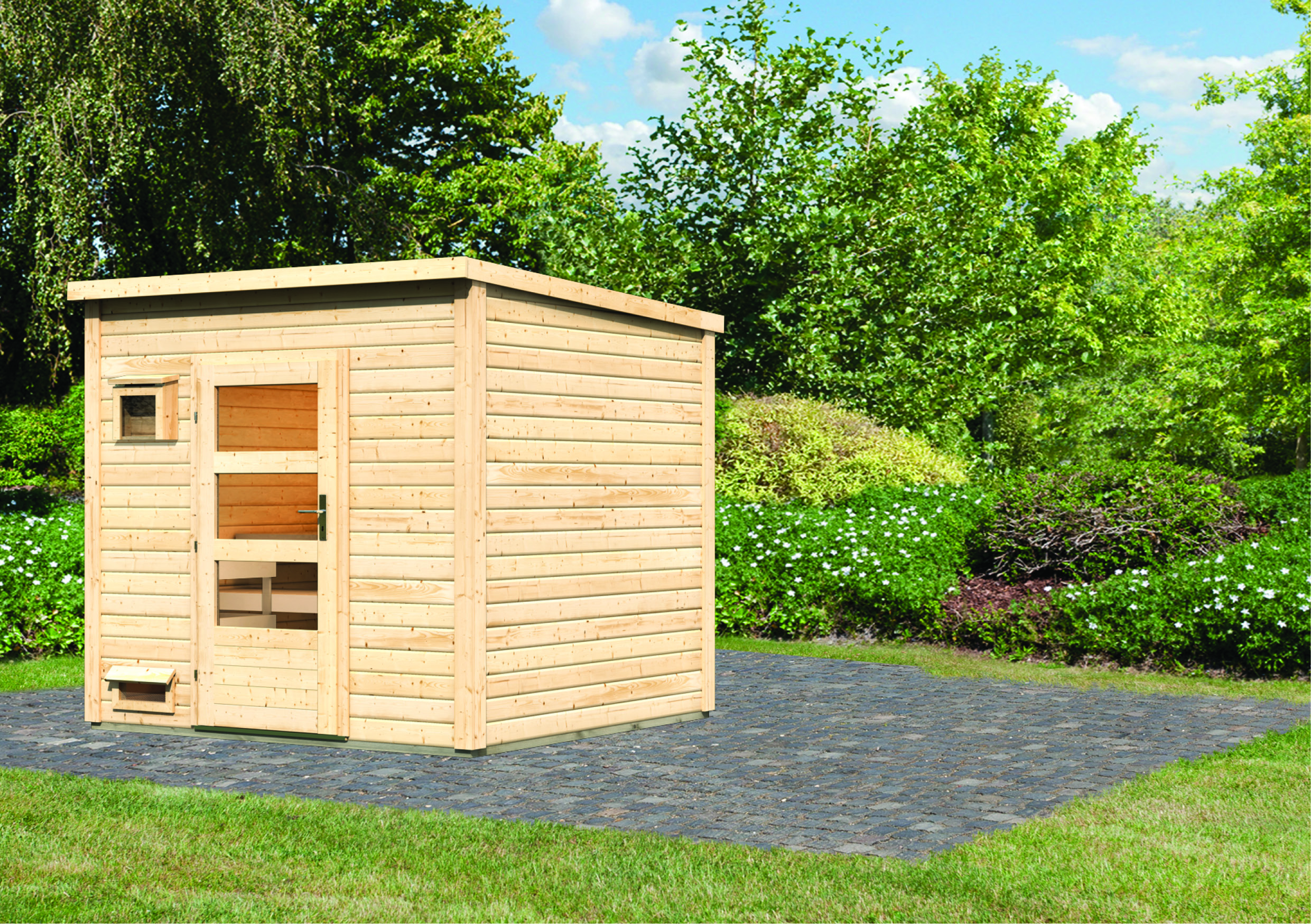 Den Tag mit einem entspannten Saunagang ausklingen lassen mit einer eigenen Außensana. Wahlweise mit Anbaudach hat die Sauna ein Außenmaß von 231x231 cm. Drei Bänke bieten Platz zum gemeinsamen Sitzen oder Liegen in der heimischen Sauna.