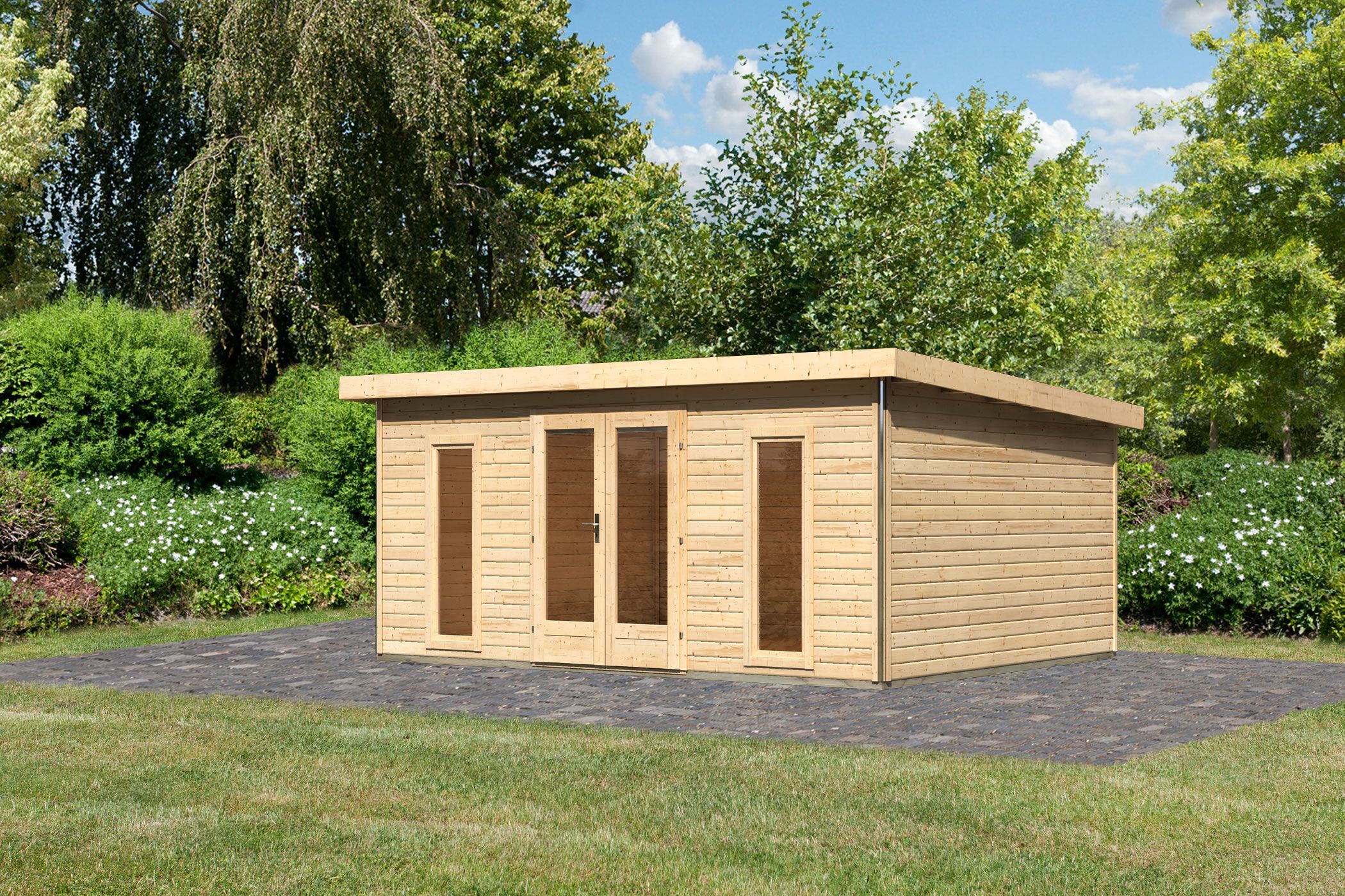 Karibu großes Poolhaus “Radeburg 4” Pultdach modern aus Holz in Natur