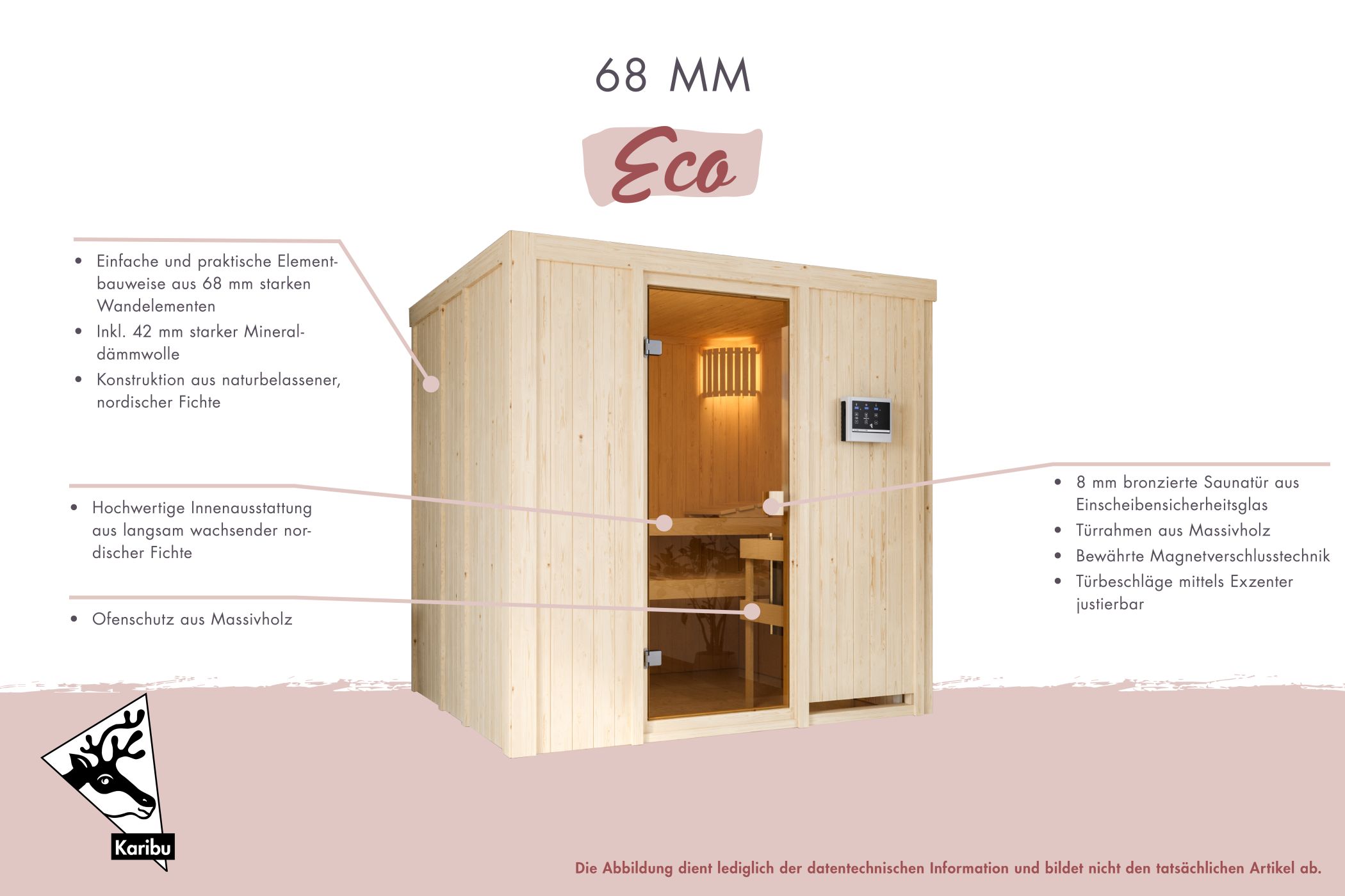 Save without loss of quality with the Arvika system sauna made of 68mm Nordic spruce wood.The sauna is assembled using the simple element construction method and thus enables quick installation. With an external dimension of 231 x 231 x 198 cm (W/D/H), this sauna model offers enough space to relax and feel good together. The 3 sauna benches made of Nordic spruce wood provide seating or lounging options in the sauna. You can expand the interior with our optionally available accessories. With the 3-SET of the Premium headrest, you can not only optimally support your head. By pushing two headrests together, you create a vein support for your legs. If you have respiratory problems, our salt crystals can help you. By attaching a Salzkristall lamp or a Salzkristall Vital Brine, you create a valuable, salty air during the sauna. This enables a gentle and effective treatment of the respiratory tract and can prevent inflammation. You can heat the air inside the sauna with an optionally selectable 9kW sauna heater. Choose between a stove with integrated control, a 9kW stove with external control Easy or our all-rounder, the 9kW organic combi stove. With this, in addition to the normal Finnish sauna, a steam sauna is also possible. So you can easily equip the sauna to your wishes and needs. The stove protection grille included in the scope of delivery protects you from burns on the hot sauna stove. A bronzed all-glass door made of toughened safety glass with magnetic closure technology closes the sauna cabin and prevents the heat from escaping. Furnish your sauna area with the Arvika solid wood sauna at a fair price without any loss of quality.