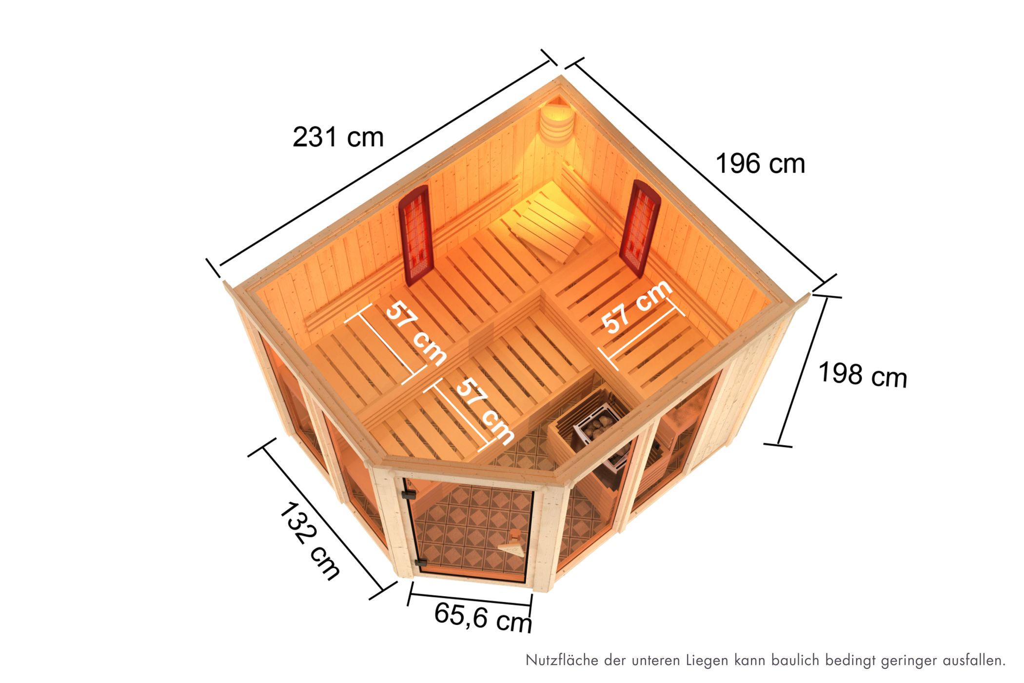 Genau die Entspannung, die Sie sich wünschen. Die Sauna-Infrarot-Kombination Ava lässt ist eine Sauna, die keine Wünsche mehr offen lässt. Nutzen Sie die warme und beruhigende Saunaluft und stärken Sie Ihr Herz-Kreislauf-System oder nutzen Sie die Tiefenwirkung der Infrarotstrahler bei Muskelbeschwerden und Verspannungen. Mit der Multifunktionssauna Ava sind Sie auf alles vorbereitet. Ausgestattet mit einem 9kW-Saunaofen, zwei Infrarotstrahlern, drei Saunaliegen aus weichem Espenholz, Bankblenden und Rückenlehnen, einem Ofenschutzgitter-Premium und einer Kopfstütze bringt die Sauna bereits alles mit, was Ihr Herz begehrt. Nach einem langen und harten Arbeitstag im Büro passiert es schnell, dass sich Ihr Rücken verspannt. Nun zur Erholung schnell in die Sauna und die Infrarot-Strahler angeschaltet. Im Nu sind Ihre Muskeln entspannt und Ihre Beschwerden gelindert. Mit einem Außenmaß von 196 x 231 x 202 cm (B/T/H) ohne Dachkranz bietet die Sauna genügend Platz. Genießen Sie die Möglichkeiten alleine oder mit der ganzen Familie. Die Saunabänke verfügen über eine Breite von 57 cm und ermöglichen so ein angenehmes Liegen. Bei dem Ofen können Sie zwischen einem 9kW-Ofen mit externer Steuerung oder einem 9kW-Bio-Kombiofen mit externer Steuerung wählen. Der Bio-Kombiofen verfügt, neben der klassischen finnischen Sauna, auch über eine Verdampfereinheit. Dies ermöglicht auch eine Kräuterdampf-Kur, ein Soft-Dampfbad-Feuchtwarm und eine Familiensauna. So ist garantiert für jeden das Richtige dabei. Ein echtes Highlight bieten die vier großzügigen Fenster in der Sauna. Diese lassen viel Tageslicht in das Innere und sorgen durch das bronzierte Glas für ein schönes Ambiente. Betreten können Sie die Sauna durch eine bronzierte Ganzglastür aus Einscheibensicherheitsglas mit Karibu-Türgriff. Die Wandelemente bestehen aus einer 68mm Rahmenkonstruktion mit Mineralwolldämmung und nordischen Fichtenbrettern. Machen Sie die Multifunktionssauna Ava zu Ihrem ganz persönlichen Highlight.