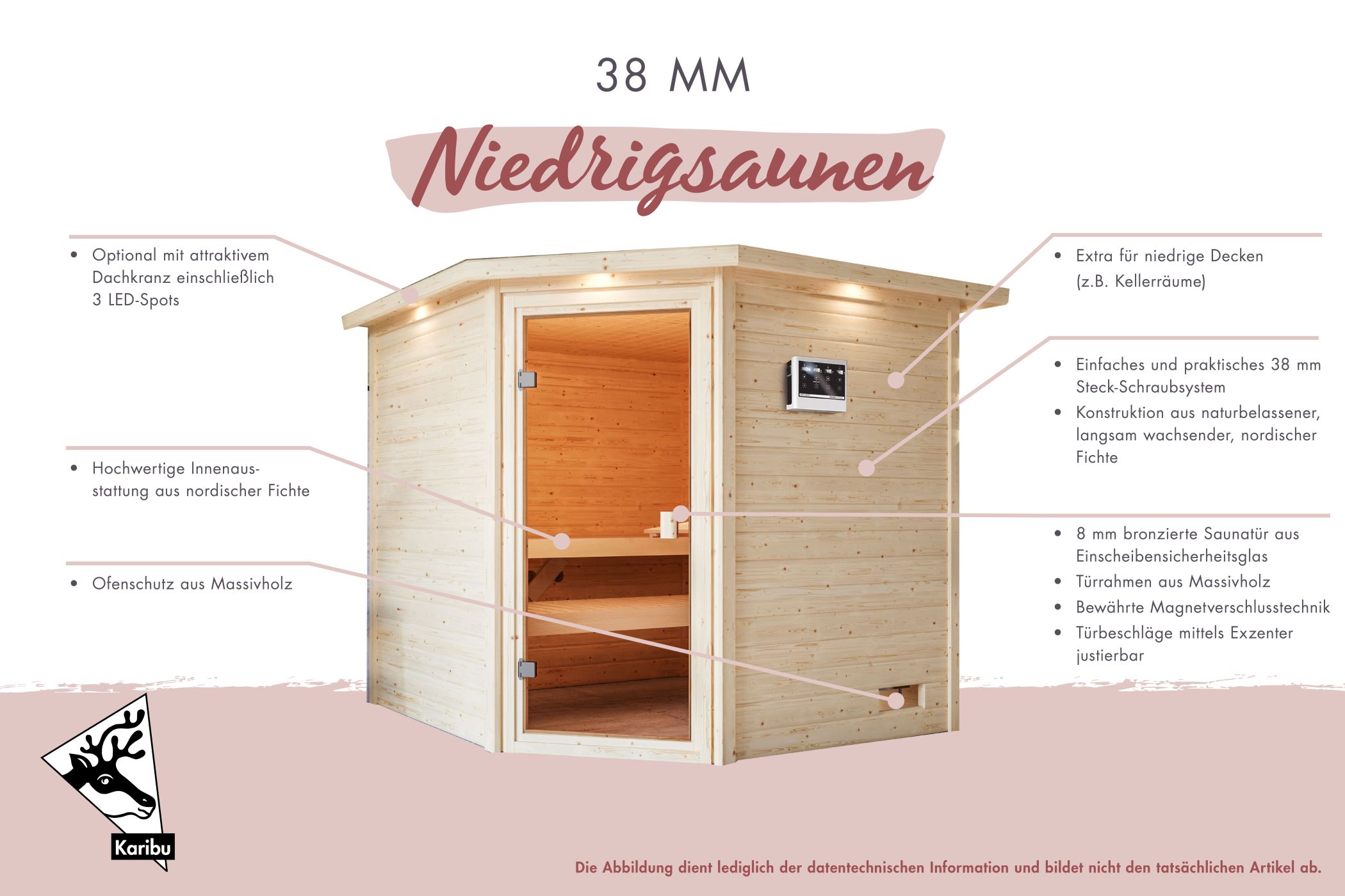 Was eignet sich für einen bislang ungenutzten Kellerraum besser, als eine eigene Sauna zum Entspannen und Wohlfühlen? Die Sauna Sauna Jada hat ein Außenmaß von 196 x 146 cm und ist, aufgrund seiner geringen Höhe von 187 cm, ideal auch für Räume mit einer niedrigen Deckenhöhe geeignet. Die Massivholzsauna besteht aus 38mm starken Wandbohlen aus nordischer Fichte, welche im einfachen Steck- und Schraubsystem montiert werden. Durch den Eckeinstieg und die besondere, fünfeckige Form, sorgt die Sauna für ein Highlight in Ihrer Wellness-Oase. Mit einem optional wählbaren Dachkranz inkl. 3 LED-Spots, können Sie die Sauna von außen beleuchten und sie so gekonnt in Szene setzen. In den Innenraum gelangen Sie durch eine bronzierte Ganzglastür aus Einscheibensicherheitsglas. Damit beim Saunieren keine Wärme entweichen kann, wird die Tür durch eine Magnetverschlusstechnik geschlossen gehalten. Auf den, im Lieferumfang enthaltenen, Liegen können Sie den Saunagang so richtig genießen. Verschönern Sie das Ambiente in Ihrer Sauna und sorgen Sie für die größtmögliche Erholung mit unserem optional erhältlichen Zubehör. Eine Saunalampe Classic in der Ecke, eine ergonomische Kopfstütze für die perfekte Liegeposition oder eine Salzkristall Vital Sole für freies Atmen macht Ihren Saunagang zu einem perfekten Erlebnis. Entspannen Sie nach einem stressigen Arbeitstag und schöpfen Sie neue Kraft aus der angenehmen Wärme auf Ihrer Haut. Heizen Sie den Innenraum mit einem optional erhältlichen, klassischen 9kW-Ofen. Dieser sorgt aufgrund seiner höheren Leistung für höhere Temperaturen und für ein angenehmes Klima im Innenraum. Der Saunaofen ist in einer Variante mit integrierter Steuerung, einer mit externer Steuerung und als Bio-Kombiofen erhältlich. Nutzen Sie Ihren Kellerraum zur Entspannung und verwandeln Sie ihn in eine Wellness-Oase mit der Massivholzsauna Sauna Jada.