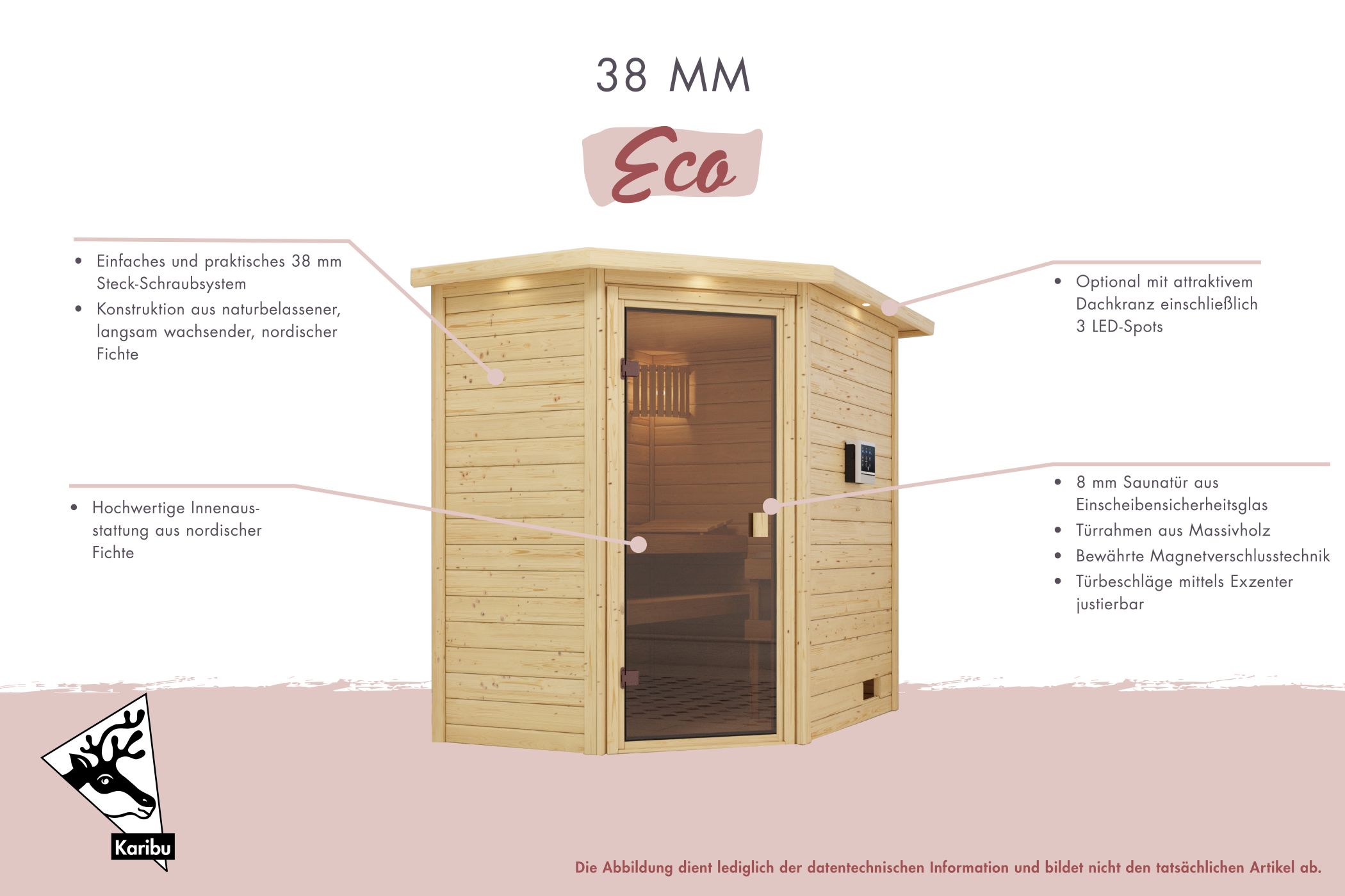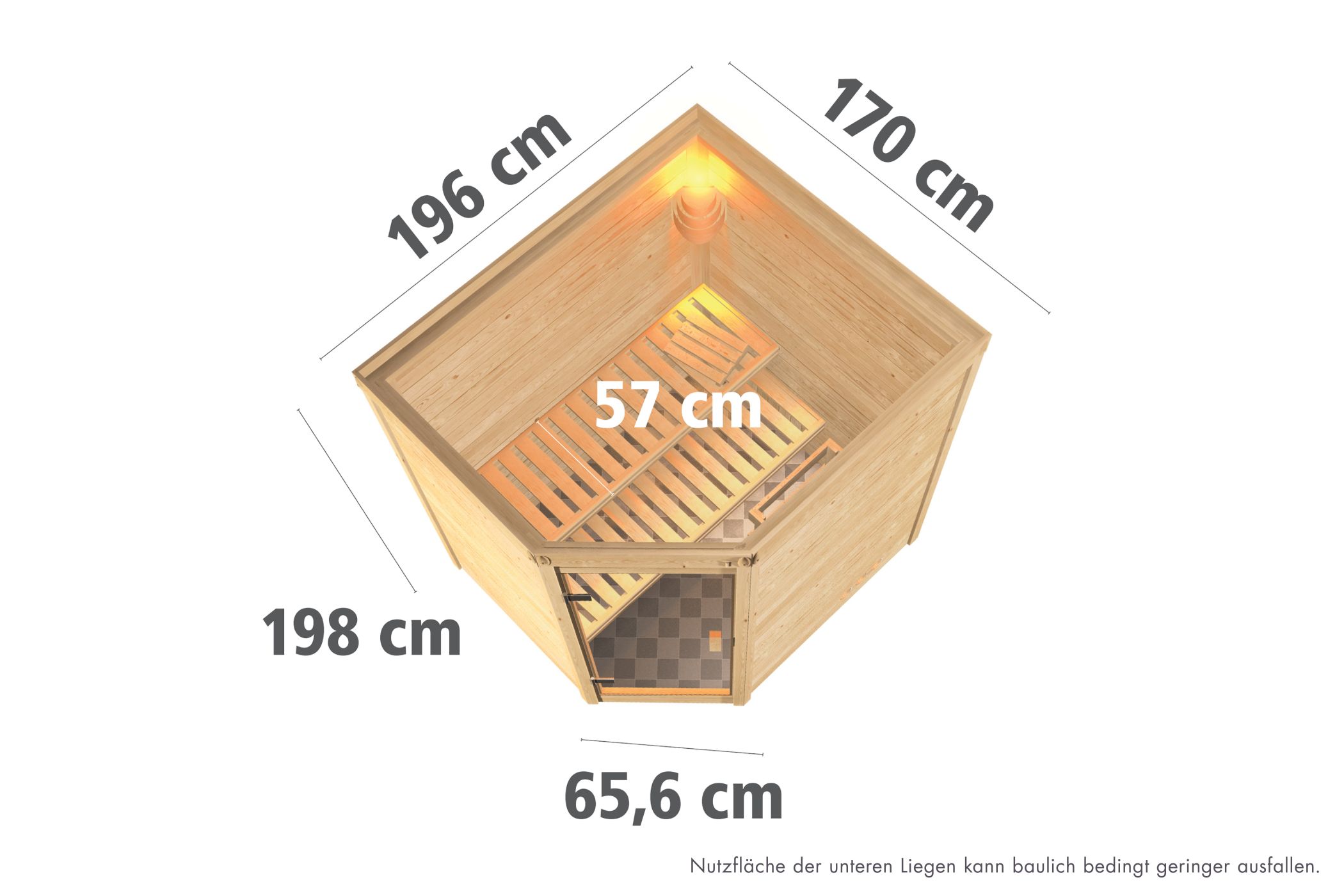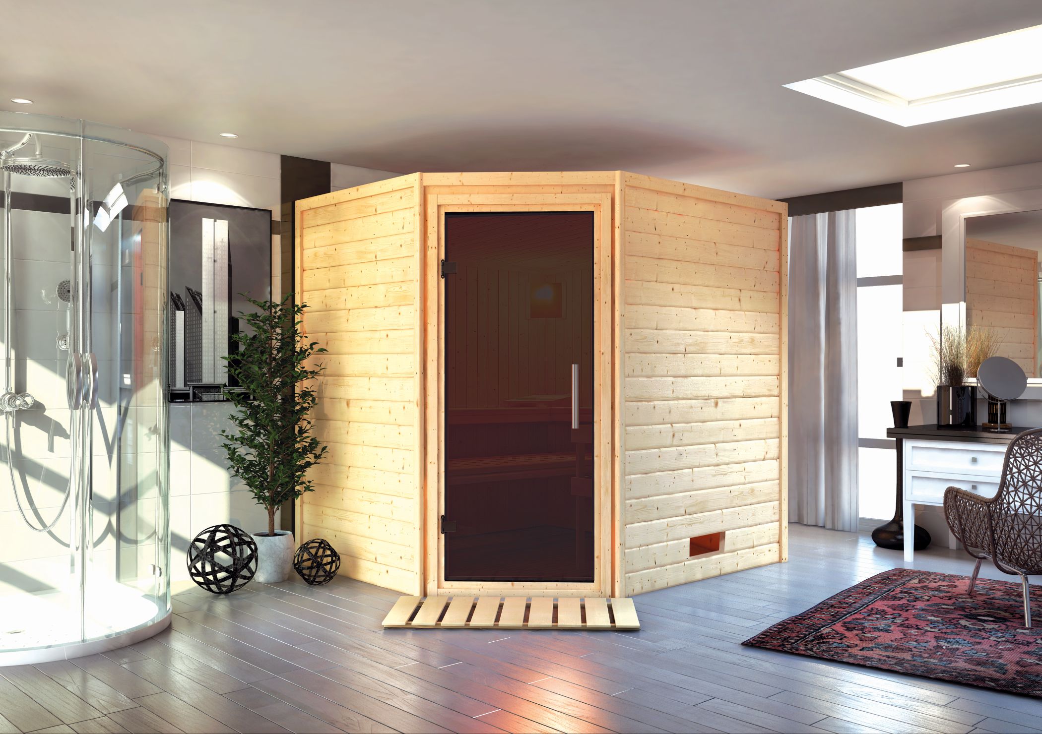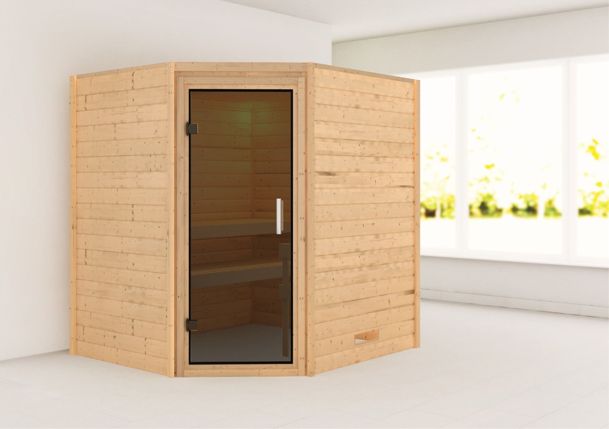 Karibu Massivholzsauna "Sauna Mia" 4 Personen ohne Ofen Glastür (grau getönt)