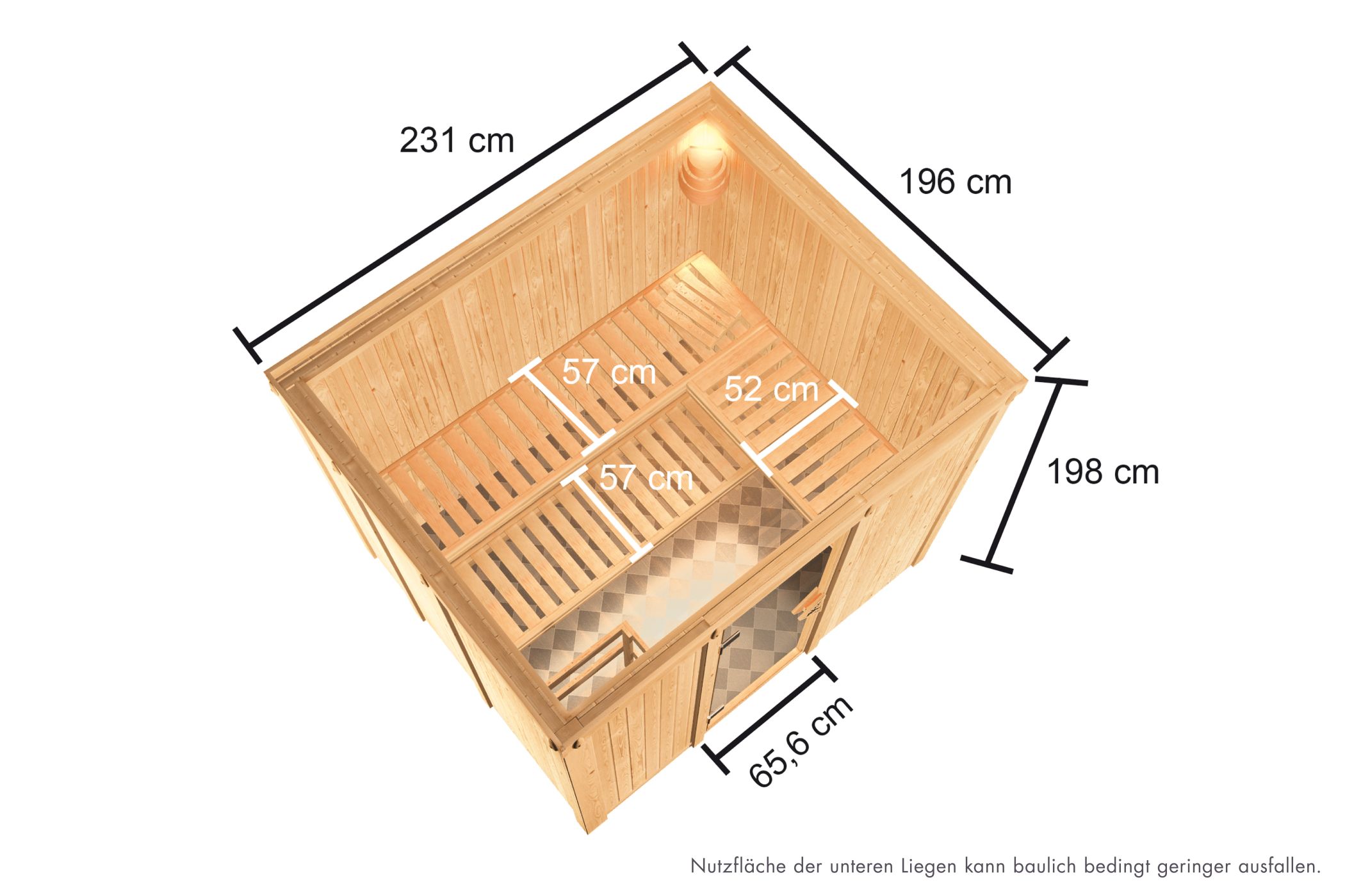 Sparen ohne Qualitätsverlust mit der System-Sauna Nybro aus 68mm nordischem Fichtenholz. Die Sauna wird mit der einfachen Elementbauweise montiert und ermöglicht so eine schnelle Montage. Mit einem Außenmaß von 231 x 196 x 198 cm (B/T/H) bietet dieses Saunamodell ausreichend Platz zum gemeinsamen Entspannen und Wohlfühlen. Für Sitz oder Liegemöglichkeiten in der Sauna sorgen die 3 Saunabänke aus nordischem Fichtenholz. Erweitern können Sie die Innenausstattung mit unserem optional erhältlichen Zubehör. Mit dem 3er-SET der Kopfstütze-Premium können Sie nicht nur Ihren Kopf optimal stützen. Durch zusammenschieben zweier Kopfstützen schaffen Sie sich eine Venenstütze für die Beine. Bei Problemen der Atemwege können Ihnen unsere Salzkristalle helfen. Durch anbringen einer Salzkristall-Leuchte oder einer Salzkristall Vital Sole schaffen Sie eine wertvolle, salzhaltige Luft während des Saunierens. Diese ermöglicht eine schonende und wirkungsvolle Behandlung der Atemwege und kann Entzündungen vorbeugen. Erwärmen können Sie die Luft im Saunainneren durch einen optional wählbaren 9kW-Saunaofen. Entscheiden Sie sich zwischen einem Ofen mit integrierter Steuerung, einem 9kW-Ofen mit externer Steuerung Easy oder unserem Alleskönner, dem 9kW Bio-Kombiofen. Mit diesem ist neben dem normalen finnischen Saunieren auch eine Dampfsauna möglich. So können Sie die Sauna ganz leicht auf Ihre Wünsche und Bedürfnisse ausstatten. Vor Verbrennungen am heißen Saunaofen schützt Sie das, im Lieferumfang enthaltene, Ofenschutzgitter. Durch eine bronzierte Ganzglastür aus Einscheibensicherheitsglas mit Magnetverschlusstechnik wird die Saunakabine verschlossen und das Entweichen der Wärme wird verhindert. Richten Sie sich Ihre Saunalandschaft ein, mit der Massivholz-Sauna Nybro und das zu einem fairen Preis ohne Qualitätsverlust.