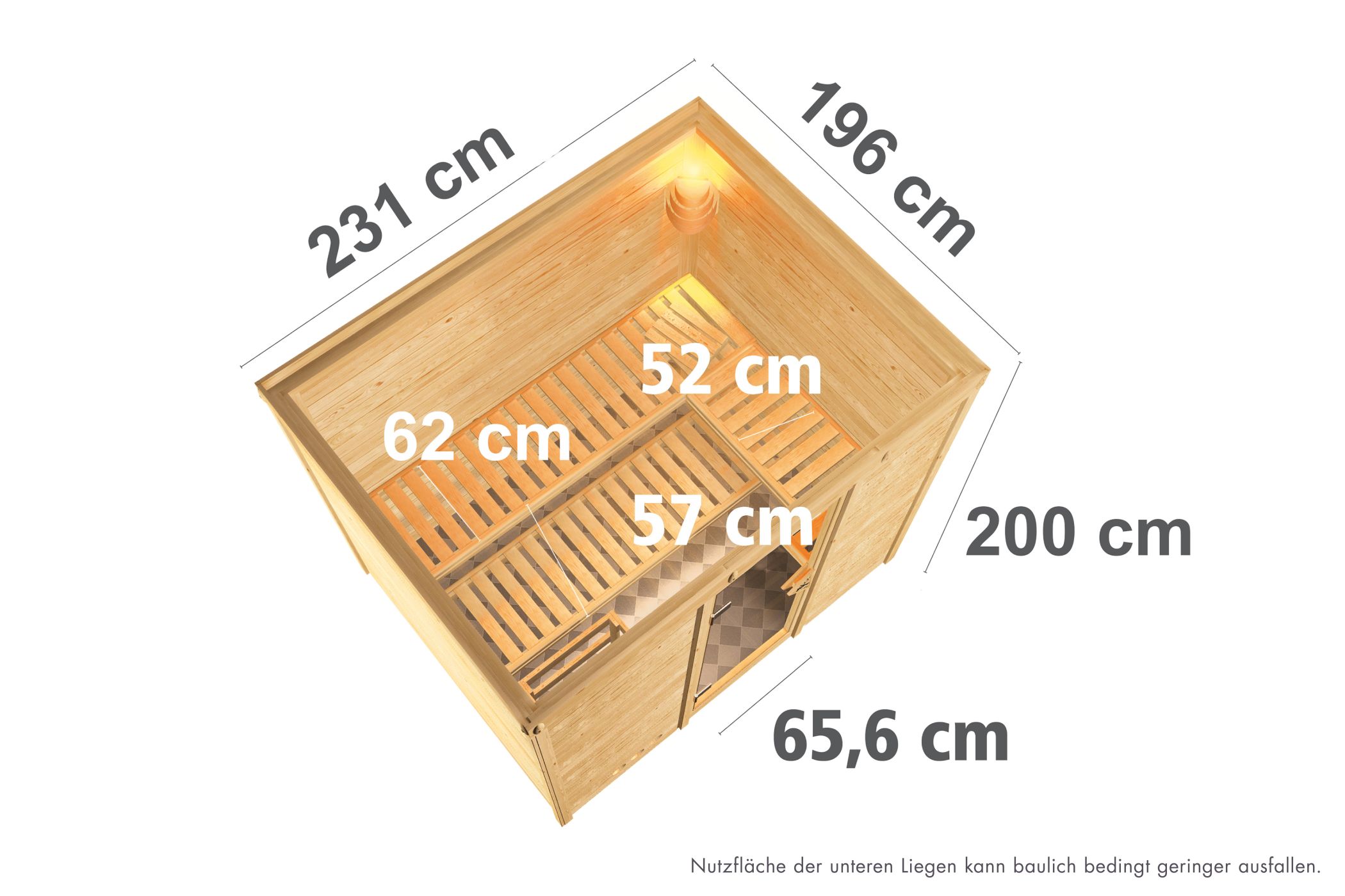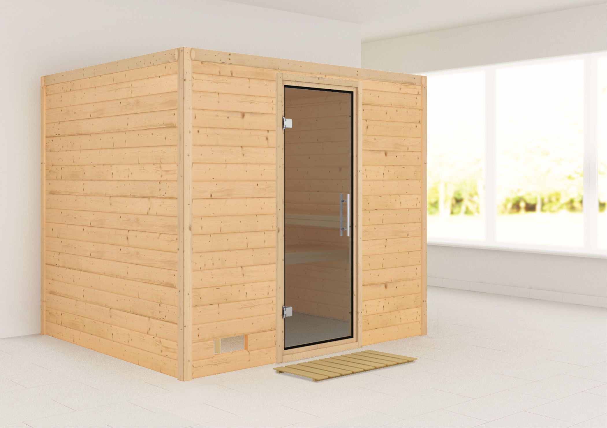 Karibu Massivholzsauna "Sauna Sonara" 5 Personen ohne Ofen Glastür (grau getönt)