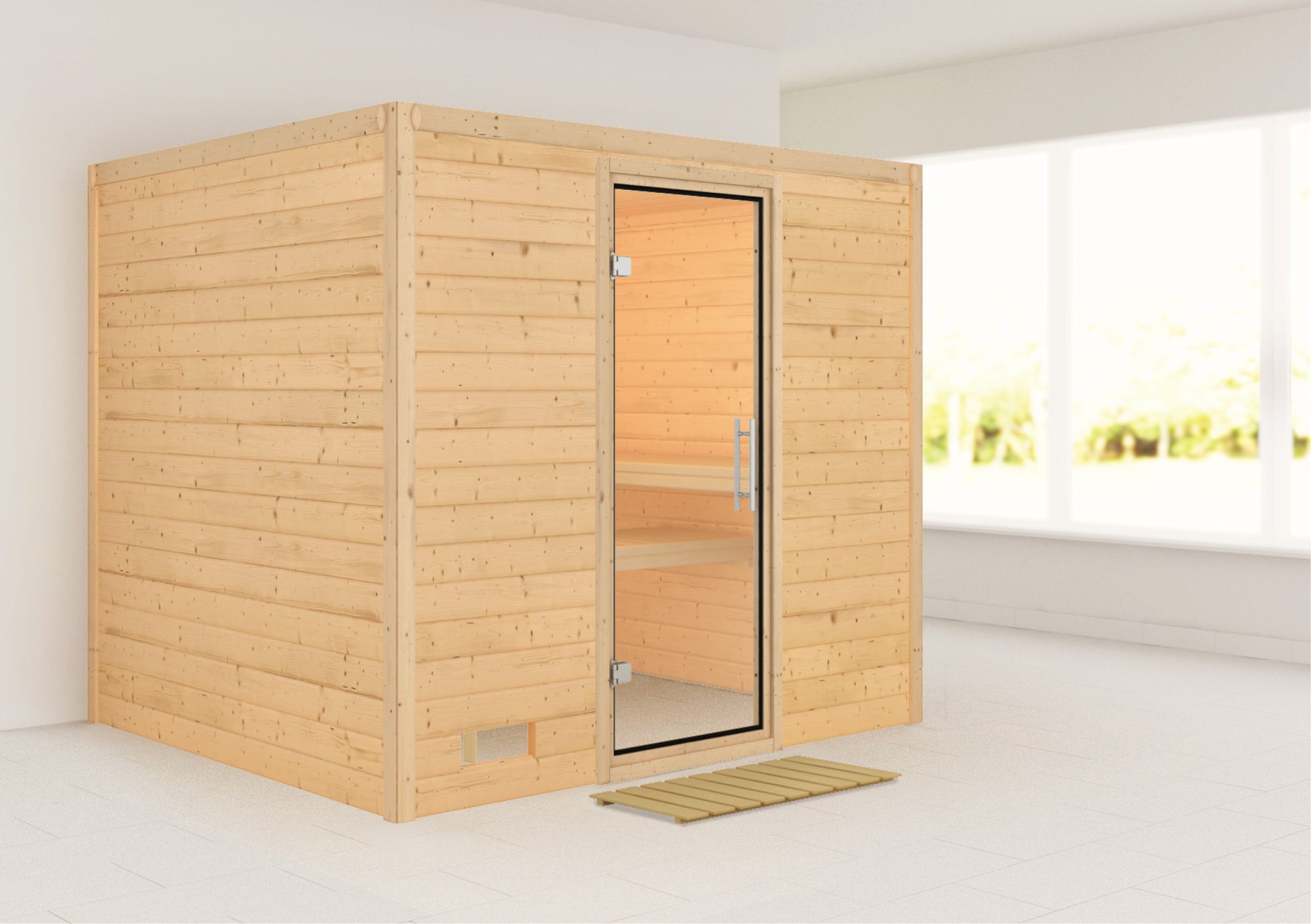 A place of peace and relaxation within your own four walls. After a stressful day, let your mind wander and pamper yourself with the cosy warmth in a sauna without having to leave the house. This is possible with our 38 mm solid wood sauna Sonara. The stable construction with 38 mm planks made of Nordic spruce wood is mounted in a simple plug-and-screw system. The solid solid wood walls create an ideal indoor climate inside the sauna according to the Finnish model. An optionally selectable roof wreath including 3 LED spotlights skilfully sets the scene for the sauna. Choose one of four possible door variants and adapt your sauna optimally to your own ideas. Whether energy-saving with a wooden door with insulating glass, classic with a bronzed all-glass door, modern with an all-glass door in graphite colours or simple with a clear all-glass door. You are guaranteed to find the right thing for you here. With an external dimension of 231 x 196 x 200 cm (W/D/H) or for the roof wreath model 259 x 210 x 205 cm (W/D/H). The Sonara sauna is the ideal size for relaxation and well-being. Expand your possibilities with the optionally available 9kW bio combi oven. In addition to a classic Finnish sauna, you have the option of a herbal steam cure, a steam bath and a family sauna. This makes it a sauna experience for the whole family. Let yourself be convinced by the beneficial effects of sauna bathing. With regular use, you will not only feel much more relaxed. In addition, it has a positive effect on the metabolism, refines the skin's appearance and supports stress reduction. To create a special sauna feeling, the sauna will be equipped with sauna loungers and a headrest. An extra wide sauna lounger of 62cm width offers you a particularly pleasant lying comfort. A stove protection grille protects you from burns from the sauna heater. With an optionally available Salt Crystal Vital Sole or the Salt Crystal Lamp, you can clear your airways and breathe in and out deeply again. Enjoy the numerous advantages of taking a sauna and create a place of peace with the Sonara solid wood sauna.