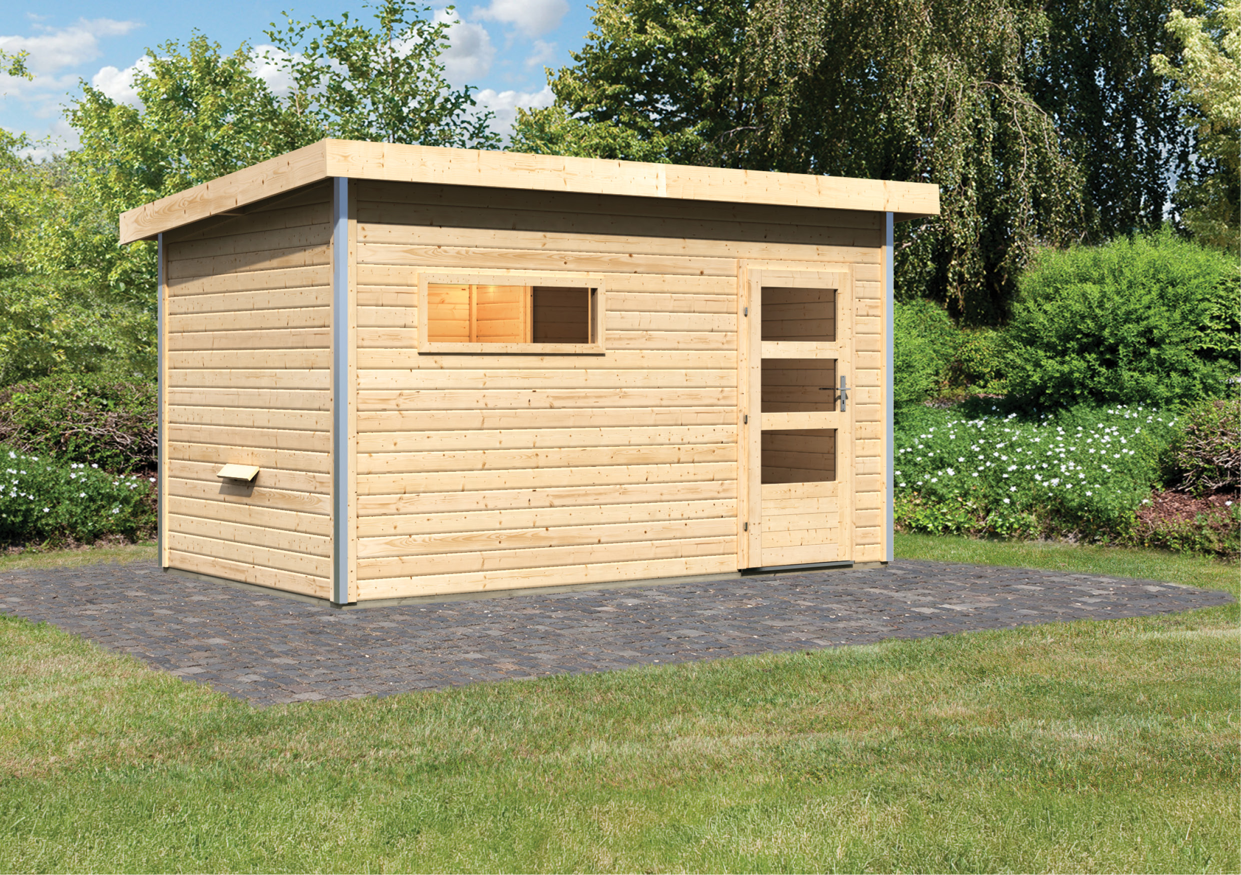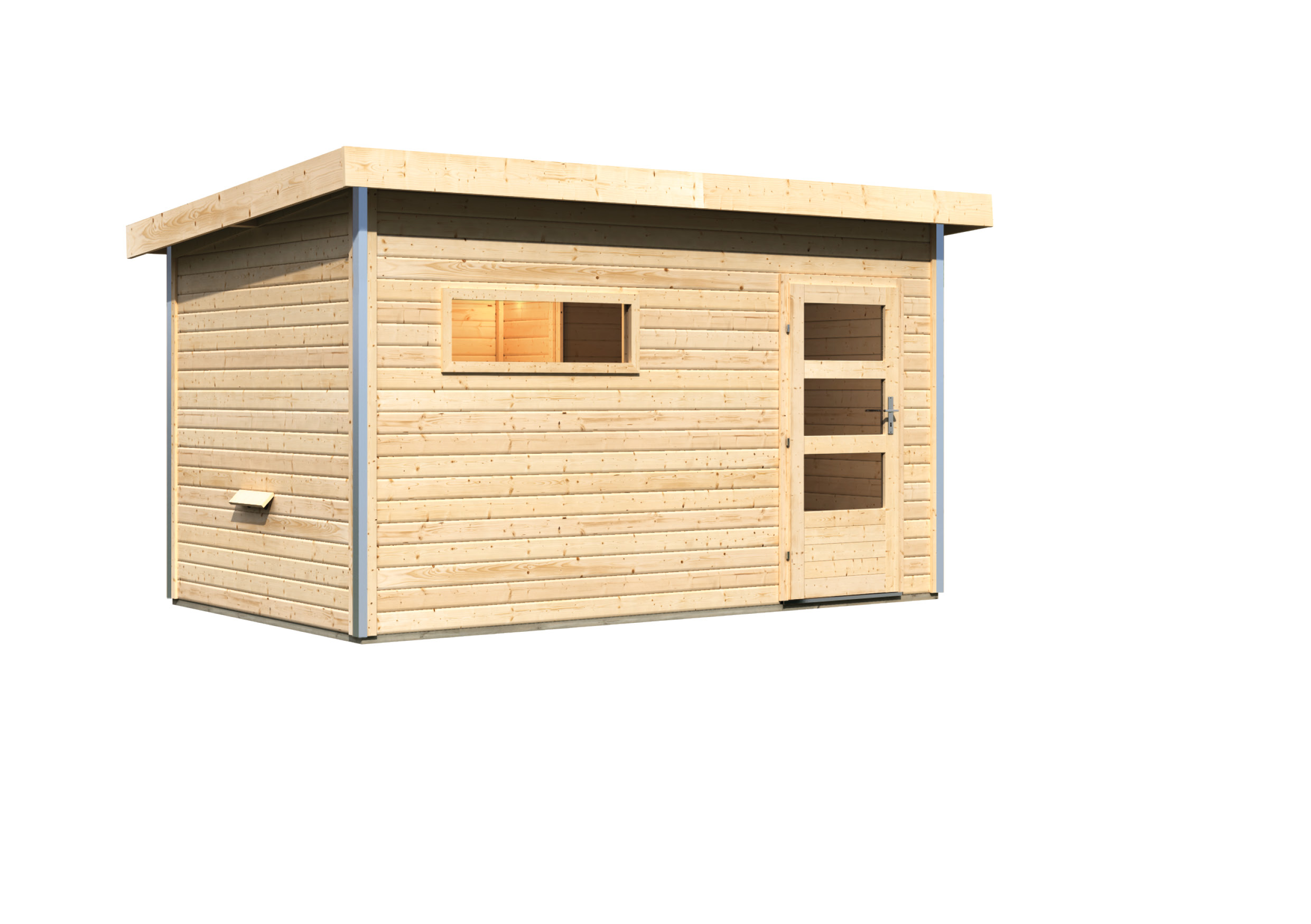 Karibu Gartensauna "Saunahaus Skrollan 3 mit Vorraum" 5 Personen Natur ohne Ofen moderne Tür