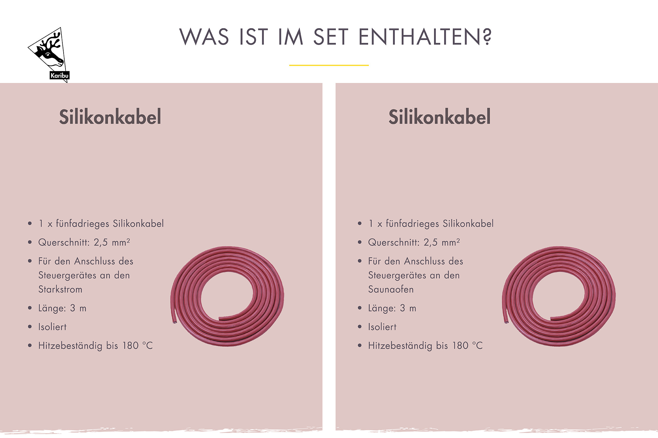 - The silicone cable set for the Finnish sauna heater includes: 2x five-wire silicone cable (2.5mm²)