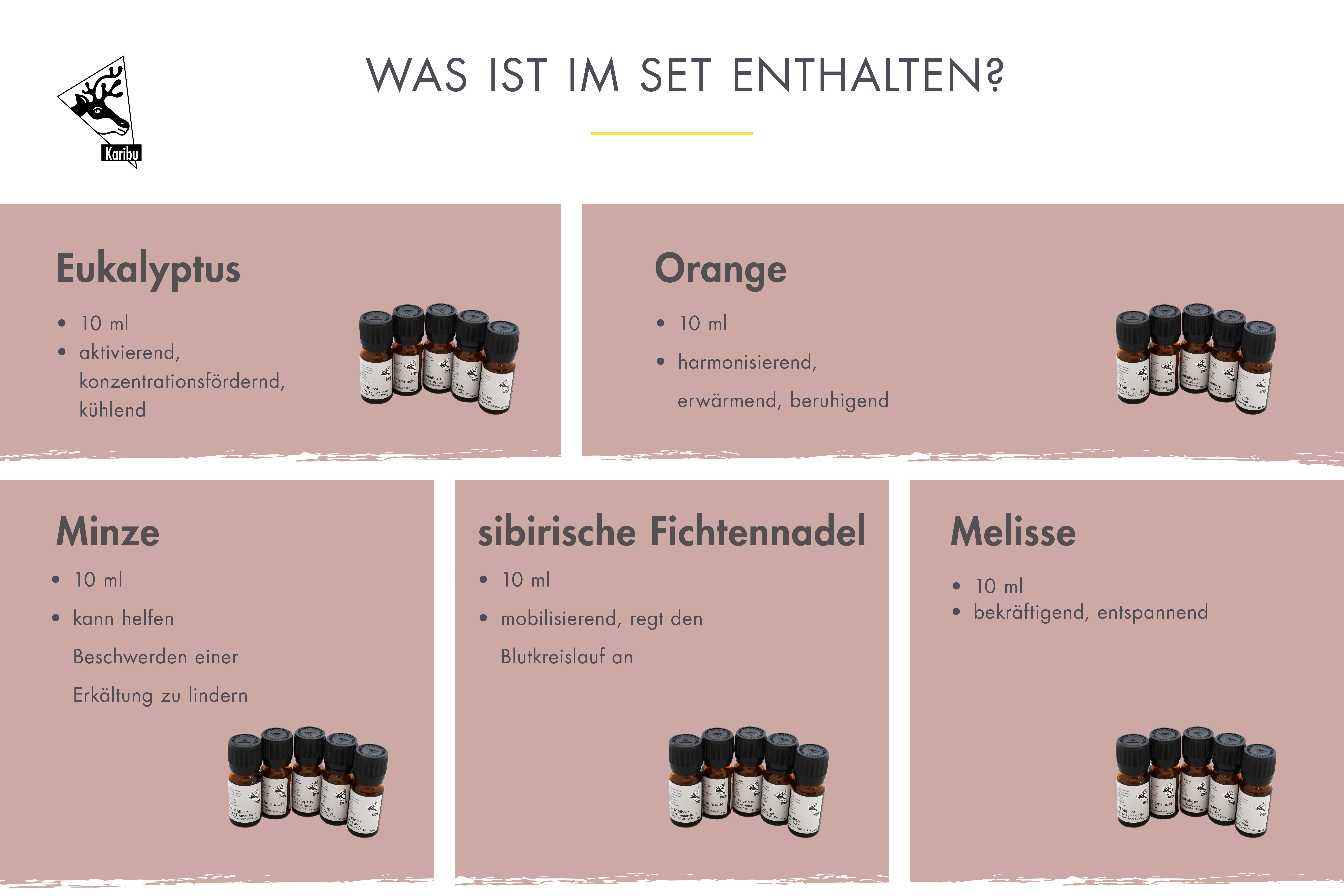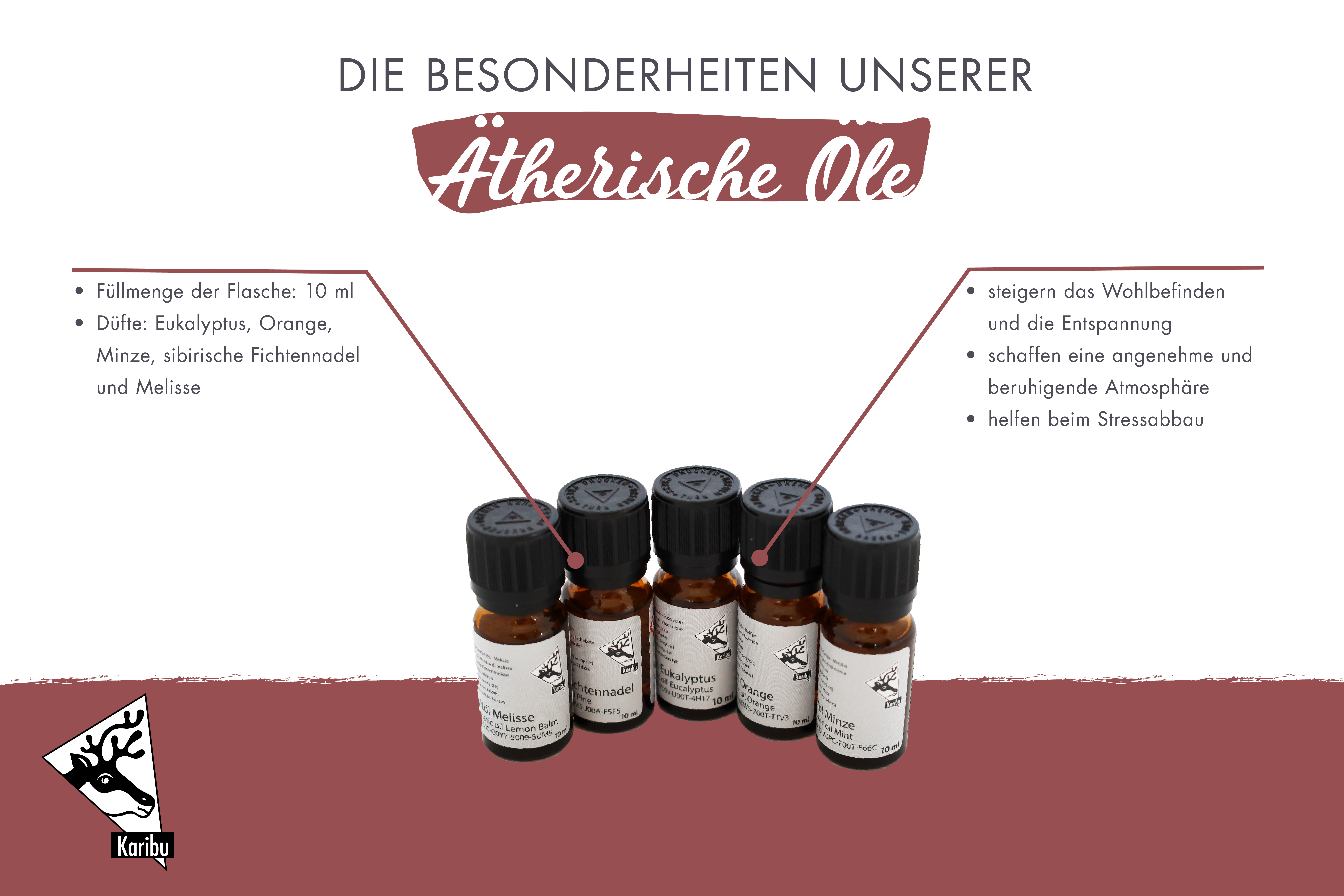 Verwöhnen Sie sich bei einem entspannten Saunagang in Ihrer eigenen Wellness-Oase mit den wohltuenden ätherischen Ölen. Die fünf verschiedenen Düfte á 10ml Eukalyptus, Orange, Minze, sibirische Fichtennadel und Melisse verwöhnen Ihre Sinne und sorgen für das passende Aroma in Ihrer Sauna. Unterstützen Sie die Stärkung Ihres Immunsystems, befreien Sie Ihre Atemwege, lösen Sie Muskelverspannungen und entspannen Sie in Ihrer Sauna. Der belebende Eukalyptus hat eine aktivierende, konzentrationsfördernde und kühlende Wirkung. So hilft dieses Öl gegen Erkältungen, Trägheit und Lustlosigkeit. Die Orange hingegen wirkt harmonisierend, erwärmend und beruhigend. Bei Kopfschmerzen, Erkältung und Heiserkeit kann die Minze als Aroma in Ihrer Sauna helfen die Beschwerden zu lindern. Bringen Sie den typisch finnischen Duft in Ihre Sauna mit der sibirischen Fichtennadel. Sie wirkt mobilisierend, regt den Blutkreislauf an und wirkt sich positiv bei Asthma, Schnupfen und Bronchitis auf den Körper aus. Nach einem ermüdend langen Tag die Abwehrkräfte stärken und neue Kraft schöpfen. Hierbei unterschützt Sie die erfrischende Melisse. Nutzen Sie den Saunagang noch effektiver und tun Sie gleichzeitig etwas für Körper, Geist und Seele mit den wohltuenden ätherischen Ölen.