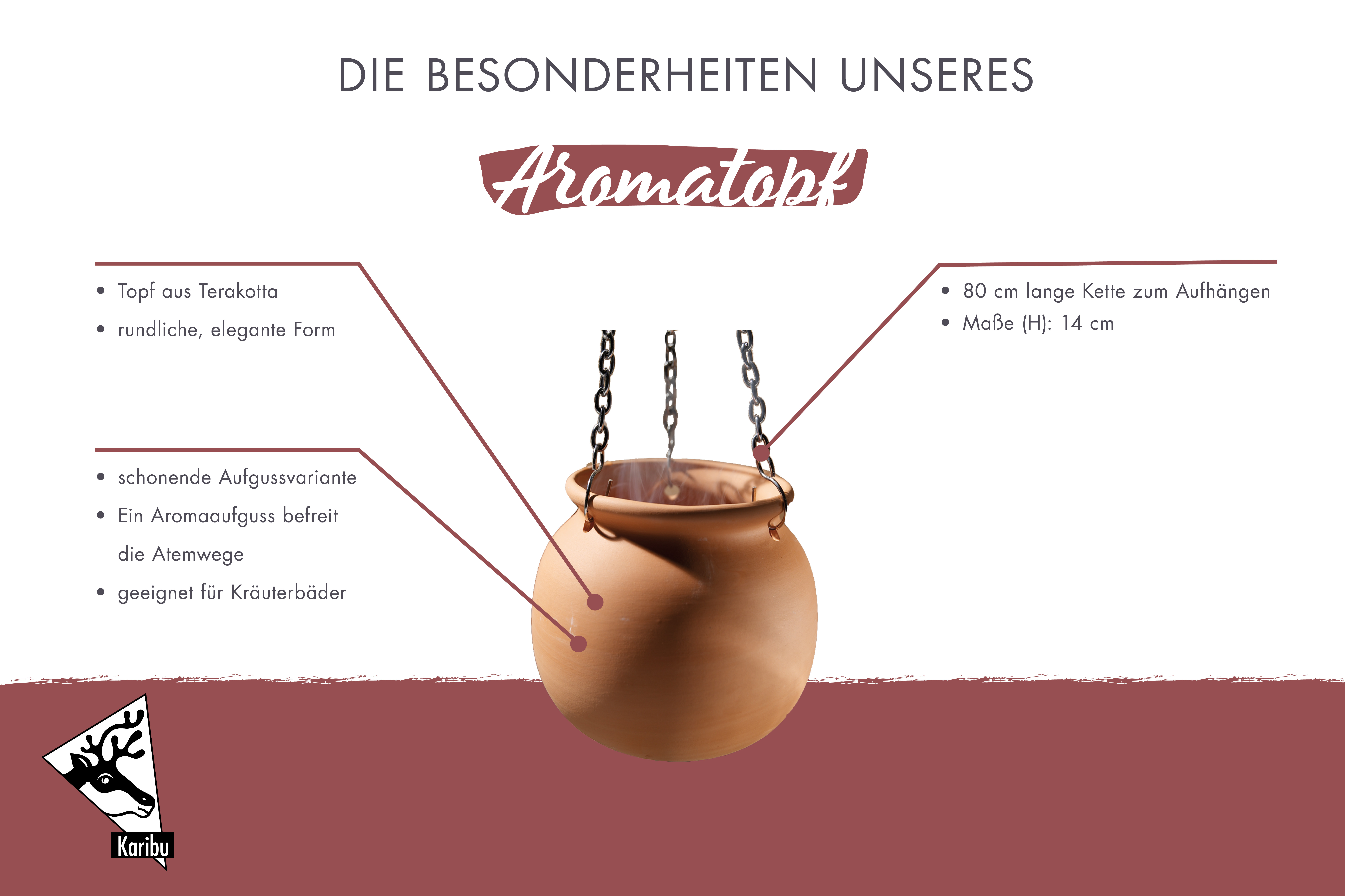 Schaffen Sie das richtige Ambiente in Ihrer Sauna und verbreiten Sie den passenden Duft mit unserem stilvollen Aromatopf aus Terrakotta. Zu einem perfekten Saunaerlebnis in Ihrer eigenen Wellness-Oase gehört neben einer schönen Lichtquelle auch der perfekte Geruch. Der Aromatopf wird über dem Ofen aufgehängt. Durch die Wärme des Ofens verdampfen das Wasser und die Duftstoffe schnell und werden an den Raum abgegeben. So entsteht das gewünschte Aroma. Durch die rundliche, elegante Form sorgt der Aromatopf zusätzlich zu einem schönen Accessoire in Ihrer Sauna. Gehalten wird der 14cm hohe Aromatopf von einer 80cm langen Kette. Unterstützen Sie die Stärkung Ihres Immunsystems, befreien Sie Ihre Atemwege, lösen Sie Muskelverspannungen und entspannen Sie in Ihrer Sauna. Bringen Sie das gewünschte Aroma in den Raum mit dem Aromatopf aus Terrakotta.