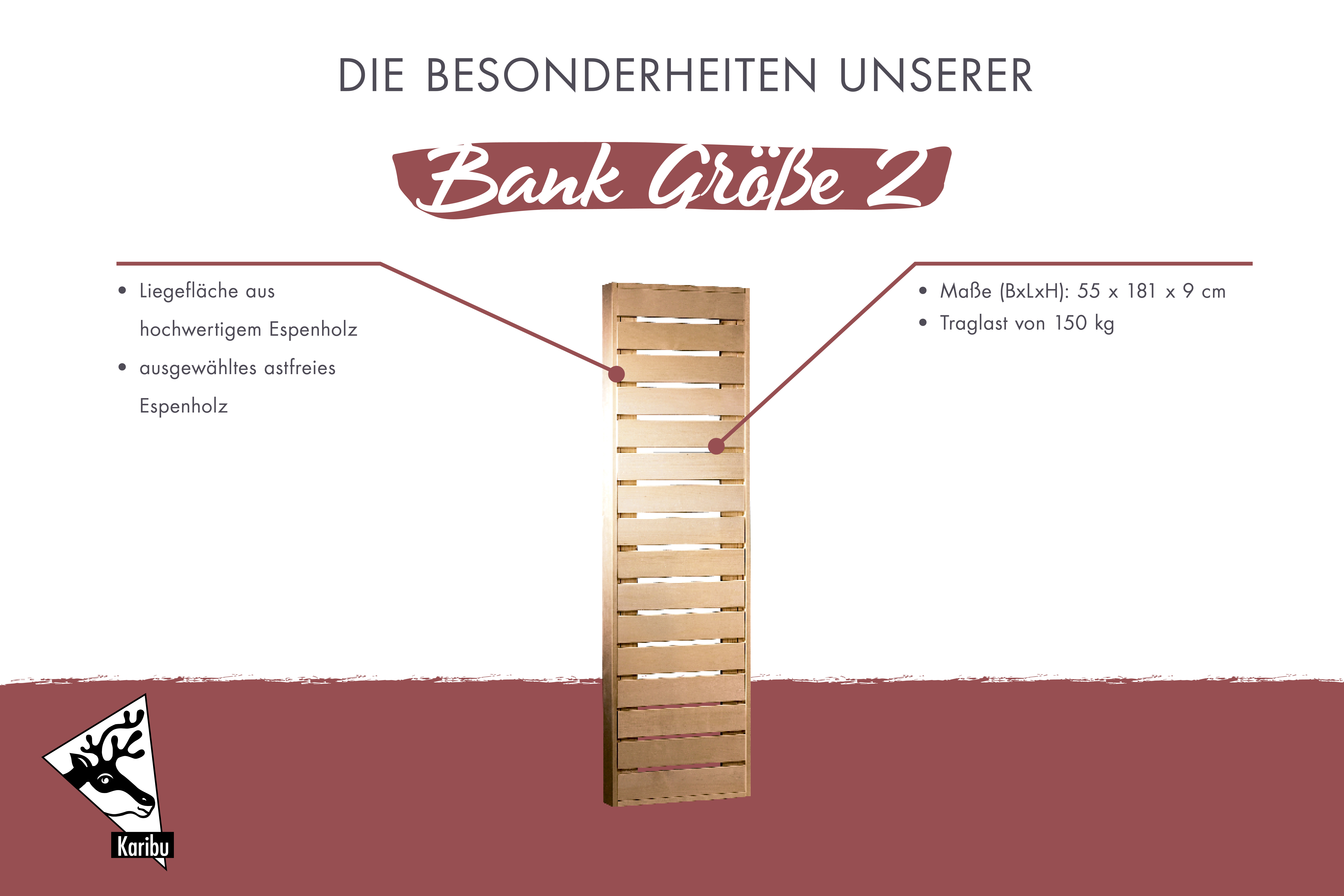 Möchten Sie die Liege und Sitzmöglichkeiten in Ihrer Saunakabine erweitern? Dies ist mit den Bänken aus unserem Zubehörsortiment kein Problem. Durch die drei unterschiedlichen Längen ist bestimmt auch die Richtige für Ihre Karibu-Sauna dabei. Die Liegefläche besteht aus hochwertigem Espenholz und sorgt so für ein angenehmes Gefühl. Die erste Größe eine Breite von 50 cm während Größe zwei und drei über eine Breite von 55 cm verfügen. Die Länge beträgt 138cm bei Größe eins, 181cm bei Größe zwei und 216cm bei Größe drei. Alle drei Bänke haben eine Höhe von 9cm. Erweitern Sie Ihre Saunamöglichkeiten. So können Sie die Bank als Trittmöglichkeit einbauen oder Sie als Ruhebank in einer kühleren Temperaturzone nutzen, um den vor Verlassen der Sauna etwas abzukühlen. Nutzen Sie die zahlreichen Möglichkeiten und erweitern Sie Ihr Saunaerlebnis mit einer zusätzlichen Bank in Ihrer Saunakabine.