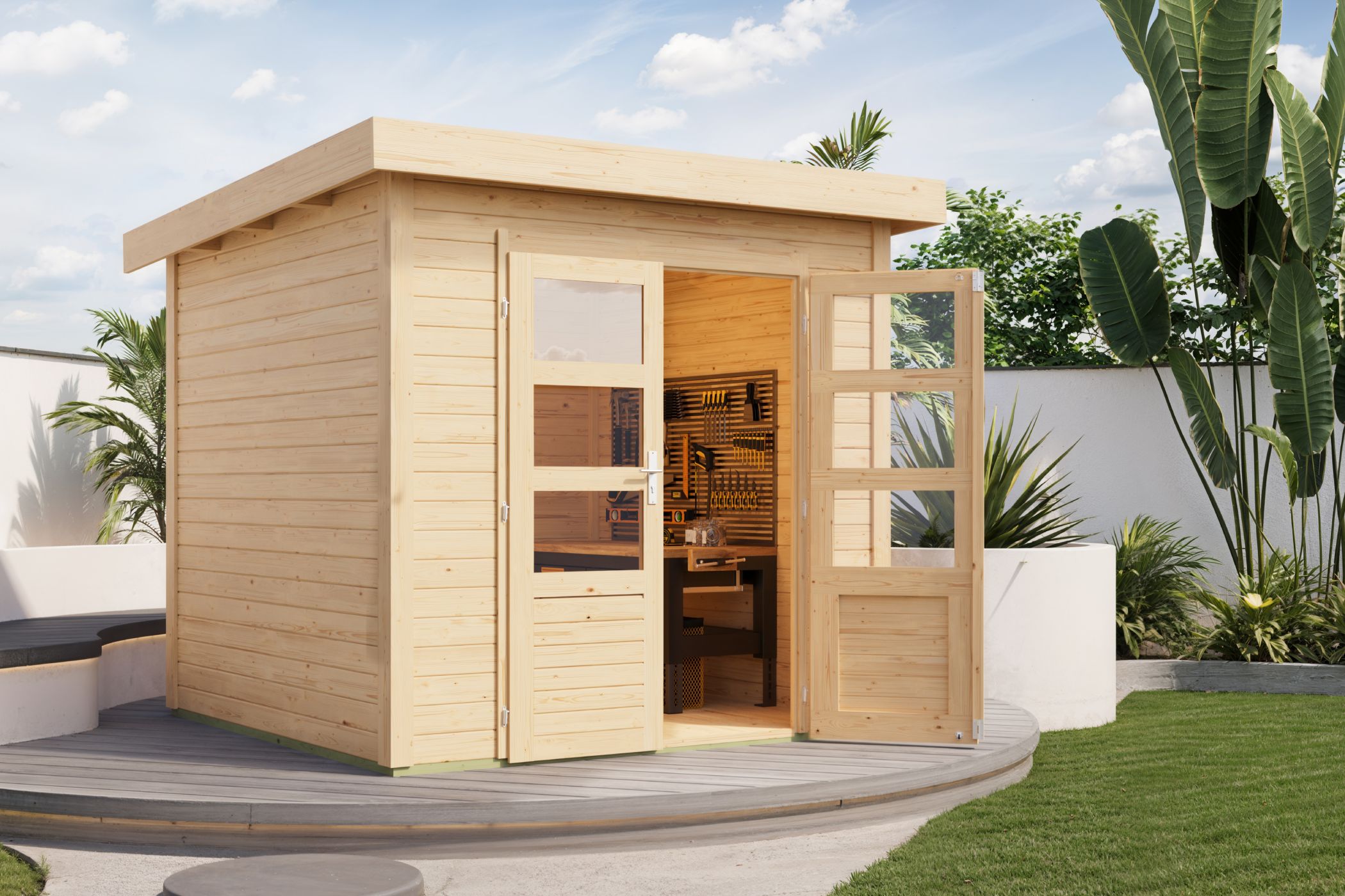 Karibu small garden house "Kolbin 3 XXL (Extra High Door)" monopitch roof modern made of wood in nature