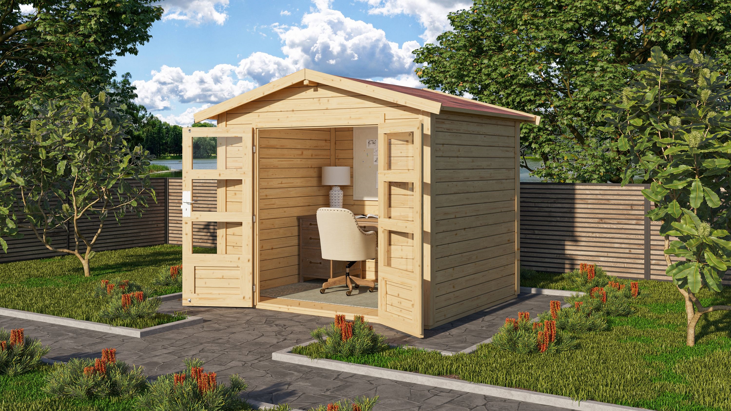 28 mm plug-in/screw system, gable roof, made of Nordic spruce. This is how the Talkau 3 garden house can be described quickly and accurately. The house is available in the colour terra grey and in natural. This gives you the opportunity to adapt your garden house perfectly to your garden ambience. Whether classic painting or direct use, the Talkau garden house is suitable for every taste. The gable roof with a roof area of 6.7 m² completes the overall picture. With external dimensions of (WxD) 234 x 194 cm, the house offers you a lot of usable space. Whether as an equipment room or for sports equipment? This decision is entirely up to you. The spacious double wing door with three light cut-outs ensures a bright interior, which is effectively protected against unauthorised entry by a cylinder lock including three keys. Let your creativity run wild and design your garden house according to your needs with the right accessories. An add-on cabinet for small garden tools, a pitched roof for firewood or a floor. The garden house can be furnished and expanded as desired. The roof overhang of 17 cm at the front, 15 cm at the sides and 17 cm at the rear provides protection for the walls from direct precipitation. From below, pressure-impregnated floor beams protect the house from rising moisture. The Talkau 3 garden shed is a real all-rounder for your garden.