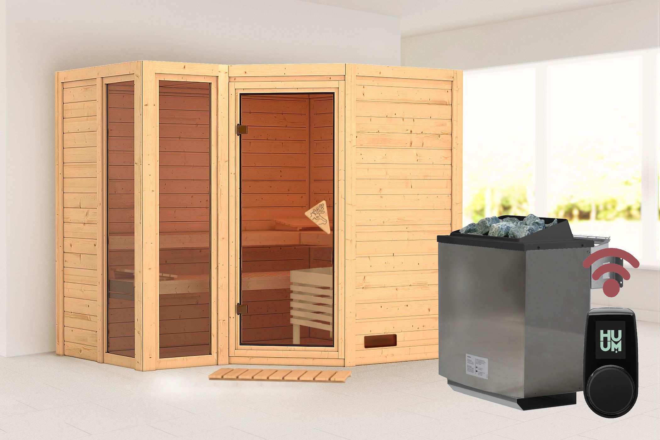 The scope of delivery already includes the Bio-Kombi stove, which can combine the Finnish dry sauna and humidity. The high-quality HUUM UKU Wifi sauna control is also included in the scope of delivery. The popular HUUM UKU sauna control system in the WIFI version (integrated WLAN module), compatible with Finnish and bio sauna heaters and can be controlled with an app (free of charge). With the UKU Wi-Fi control panel, heating up your sauna is easy and convenient. With the UKU WIFI variant, you can control and heat up your sauna either via the black control unit or via the HUUM app. To use the app, the control console must be connected to a WiFi network. For a pleasant and safe sauna experience, UKU WiFi is also equipped with various extras. The control console can be used with electric sauna heaters from various manufacturers. The HUUM control console UKU combines ease of use with safety. The stylish black control unit is easy and comfortable to use the first time. In addition, it is equipped with a child safety lock, a door sensor and overheating protection. The HUUM UKU WiFi control console requires a WiFi connection to connect to an app, so it is best suited for saunas in the private sector and for other areas covered by a WiFi network.