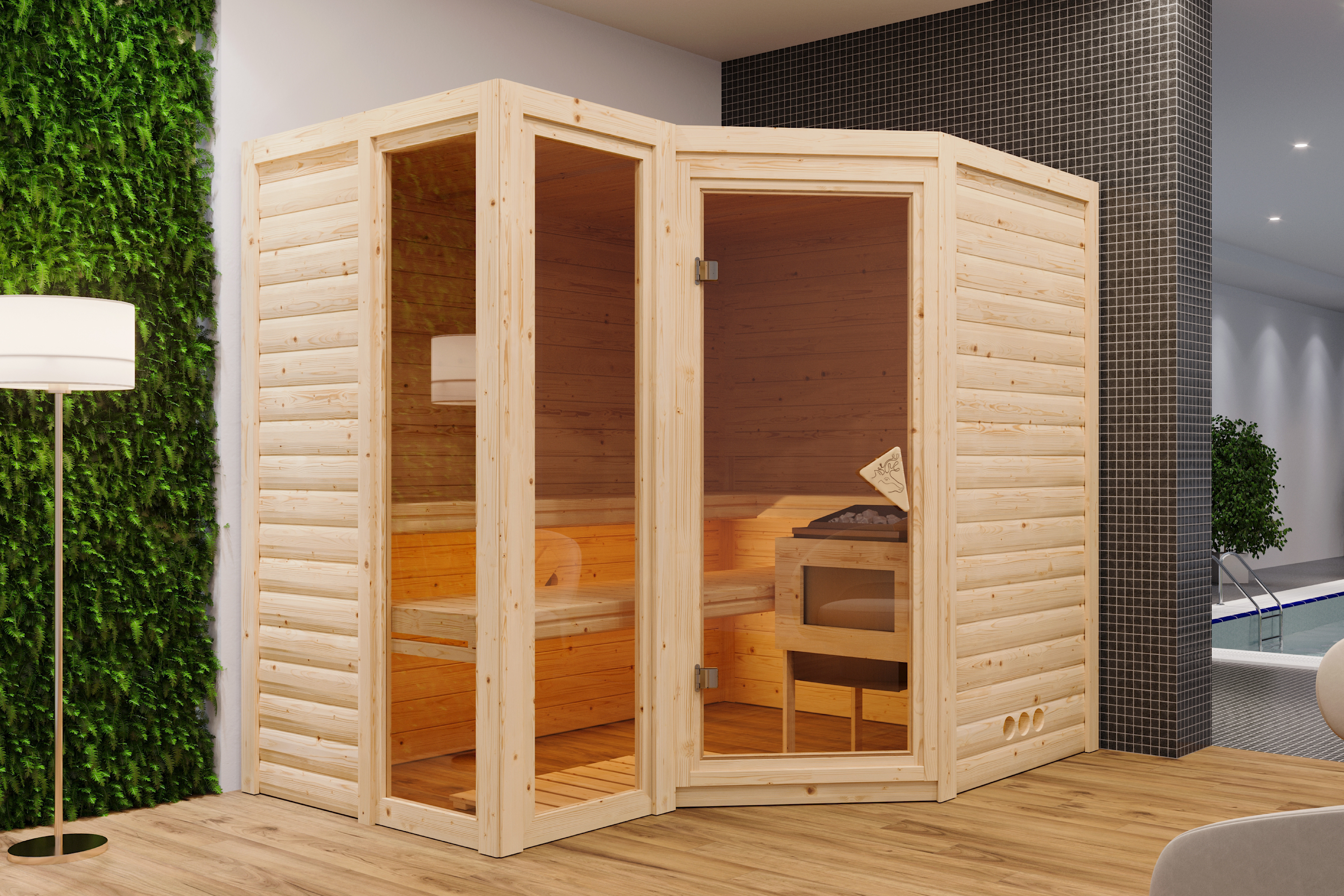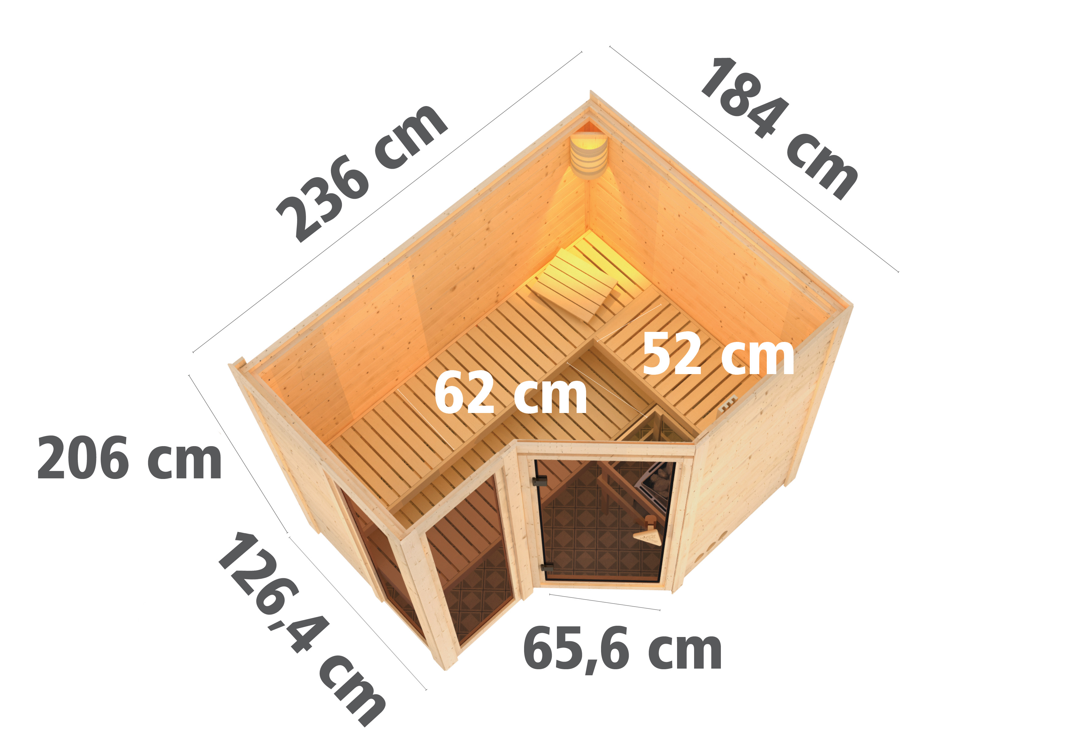 A place of peace and relaxation within your own four walls. After a stressful day, let your mind wander and pamper yourself with the cosy warmth in a sauna without having to leave the house. This is possible with our 38 mm solid wood sauna Alisa. The stable construction with 38 mm planks made of Nordic spruce wood is mounted in a simple element system. The solid solid wood walls create an ideal indoor climate inside the sauna according to the Finnish model. The interior of the sauna can be reached through a bronzed all-glass door made of toughened safety glass with a Karibu door handle. Light enters the interior through the door and the two bronzed windows and creates a warm ambience through the bronzed glass. With an external dimension of 237 x 185 x 209 cm (H/W/D), the Alisa sauna is the ideal size for relaxation and well-being. The high-quality 9kW bio combi stove is already included in the scope of delivery. In addition to a classic Finnish sauna, you have the option of a herbal steam cure, a steam bath and a family sauna. This makes it a sauna experience for the whole family. Let yourself be convinced by the beneficial effects of sauna bathing. With regular use, you will not only feel much more relaxed. In addition, it has a positive effect on the metabolism, refines the skin's appearance and supports stress reduction. To create a special sauna feeling, the sauna will be equipped with 3 sauna loungers and a headrest. An extra wide sauna lounger of 62cm width offers you a particularly pleasant lying comfort. A stove protection grille protects you from burns from the sauna heater. With an optionally available Salt Crystal Vital Sole or the Salt Crystal Lamp, you can clear your airways and breathe in and out deeply again. Enjoy the numerous advantages of taking a sauna and create a place of peace with the Alisa solid wood sauna.