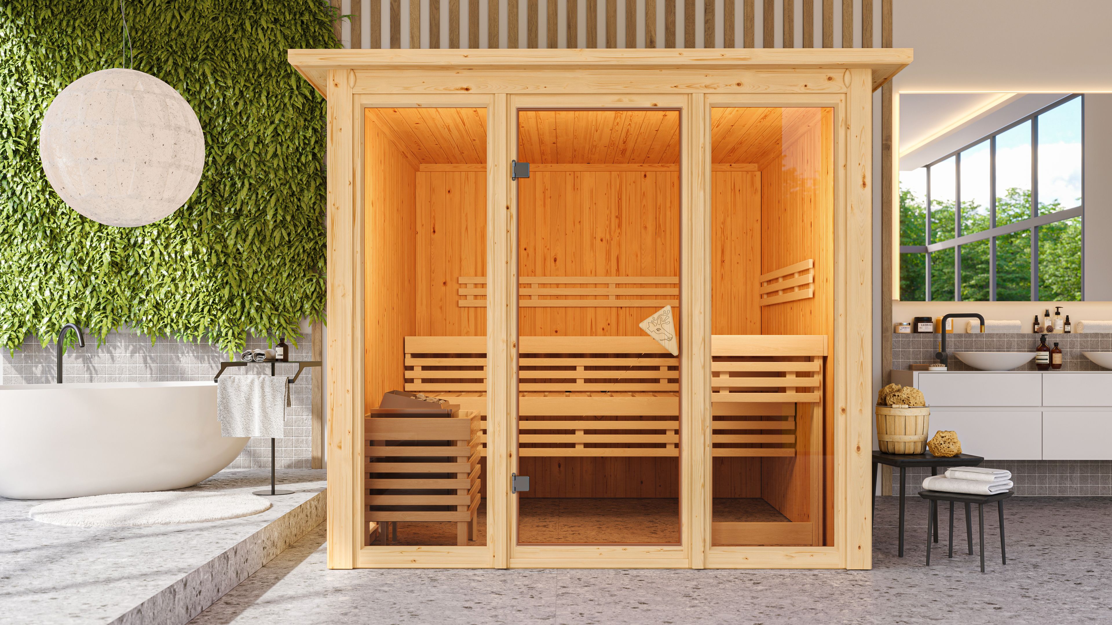 The 68 mm sauna Askja is one of our Superior saunas and has an external dimension of 216 x 234 cm without roof wreath. This means that the scope of delivery includes 2 bronzed windows, optionally a roof wreath with 3 LED spots, backrests, bench panels, loungers and an aspen stove protection grille. The shapely sauna has a front made of bronzed glass, including the sauna door with Karibu door handle with a passage size of 64 x 173 cm. The walls and roof are made of solid wood with 42 mm thick mineral insulation wool, which can be easily installed in the Prefabricated construction can be assembled.