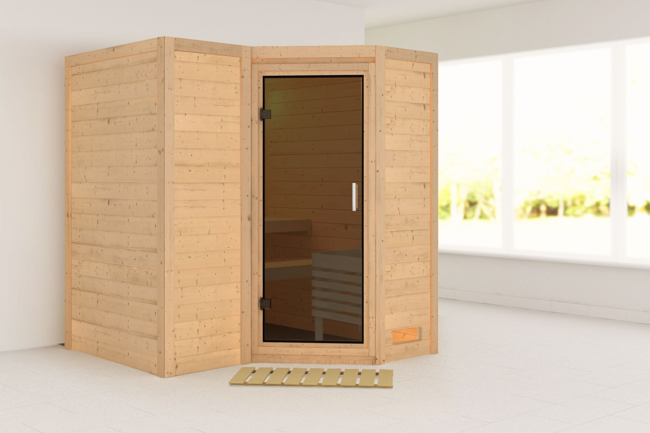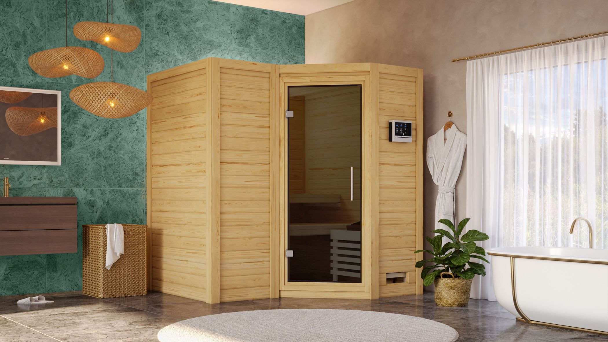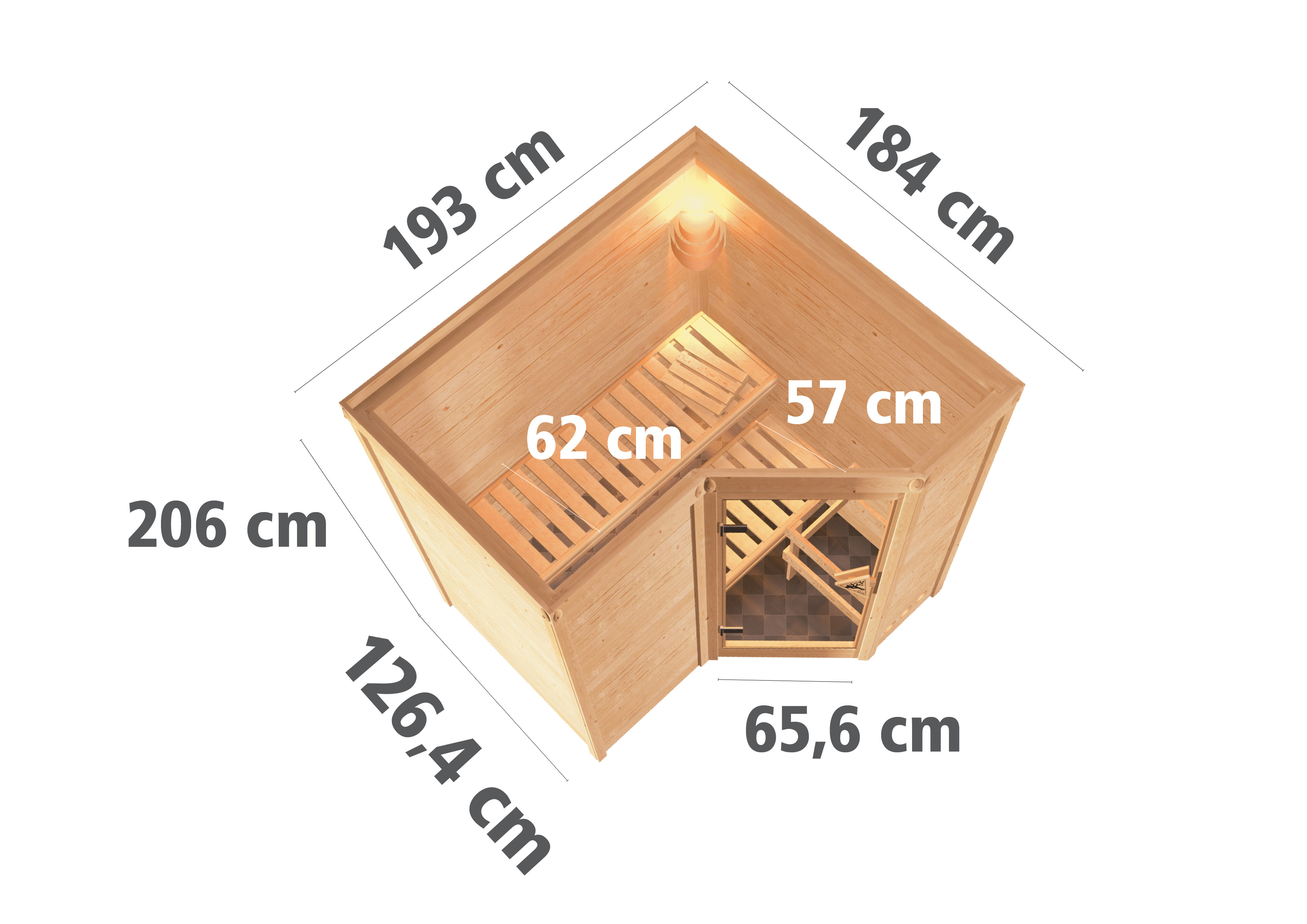With the 38 mm solid wood sauna Sahib 1 you have the opportunity to create your own oasis in your own home. After a busy day or even in winter, there is nothing better than feeling some warmth. The 38 mm planks made of Nordic spruce wood are mounted in the element system and the heat cannot escape from the sauna interior through the solid wood walls. To make the sauna more individual, you can optionally place a roof wreath including LED spotlights in it. You also have the option of choosing between four different door variants, so there is something for everyone. Whether a wooden door, insulating glass, classic with a bronzed all-glass door, modern in an all-glass door in graphite or simple with a clear all-glass door. Here you can make the sauna your sauna. With the generous size of 193 x 184 x 209 cm (W/D/H), you have plenty of space to take your mind off things. Expand the sauna with the optionally available 9kW bio combi stove. In addition to the classic Finnish sauna, you also have the opportunity to enjoy a herbal cure, a steam bath and a family sauna. Share the experience with your family and do something good for yourself. A real sauna feeling comes from the sauna loungers and a headrest and if you want a special lying comfort, you can reach for the extra wide sauna lounger of 62 cm width. To protect you from burns, a stove protection grille is mounted on the sauna heater. To clear your airways and breathe in deeply again, a Salzkristall Vital Sole or a Salzkristall lamp is optionally available. Create your own little temple of peace with the solid wood sauna Sahib 1.