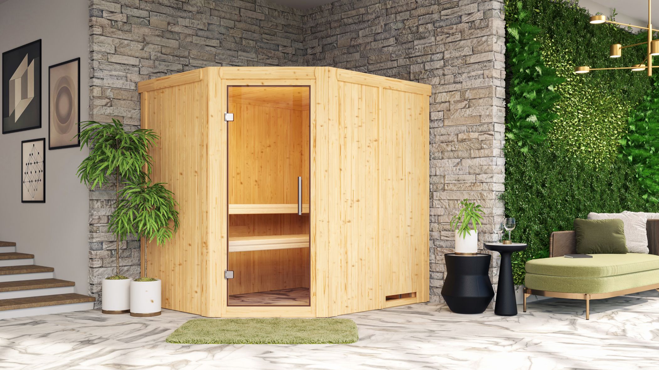 Save valuable energy with the Siirin system sauna. A 68mm thick construction, consisting of a frame construction with 42mm thick mineral insulation wool and a cladding on the visible side made of 12.5mm special Softline profiled wood, keeps the heat optimally inside the sauna. The ceiling consists of a 57mm thick special panel with mineral insulation wool. The external dimensions without roof wreath are 196 x 170 x 198cm (W/D/H). The sauna has 2 sauna benches made of aspen wood for relaxation and well-being. With an optionally available sauna heater, you can quickly bring the interior up to temperature. For the stove, you can choose between a variant with integrated control, a variant with external control or an organic combi oven. So there is guaranteed to be something for everyone. An optional roof wreath including three LED spotlights allows you to illuminate your sauna from the outside and thus set it perfectly in scene. You can enter the interior through a sauna door. Here you can choose between four possible variants. Whether classic with bronzed glass, modern with graphite-coloured glass, simple with clear door glass or suitable with an energy-saving, thermally insulated wooden door with clear insulating glass. The prefabricated wall and ceiling elements allow you to assemble them easily. Adapt the sauna to your needs with our optionally available accessories. An ergonomic headrest for optimal lying comfort, an ergonomic backrest for perfect relaxation or a modern sauna light for the right ambience. Enjoy the peace and quiet after a hard day's work with an extensive sauna session and recover from everyday life. Reduce energy consumption when taking a sauna with the 68mm Siirin system sauna.