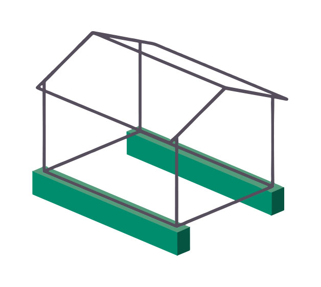 A typical point foundation consists of nine individual slabs that are arranged symmetrically along the outer walls and in the middle of the sauna base. A point foundation is only recommended if the subsoil is similar in all places. It is important that the upper edge of the concrete slabs protrudes about 5 cm from the earth. Hint: In the case of a point foundation, a foundation hole must be made every 40 cm. If there is a floor – as is usual with a garden sauna – this requirement also applies to the interior.