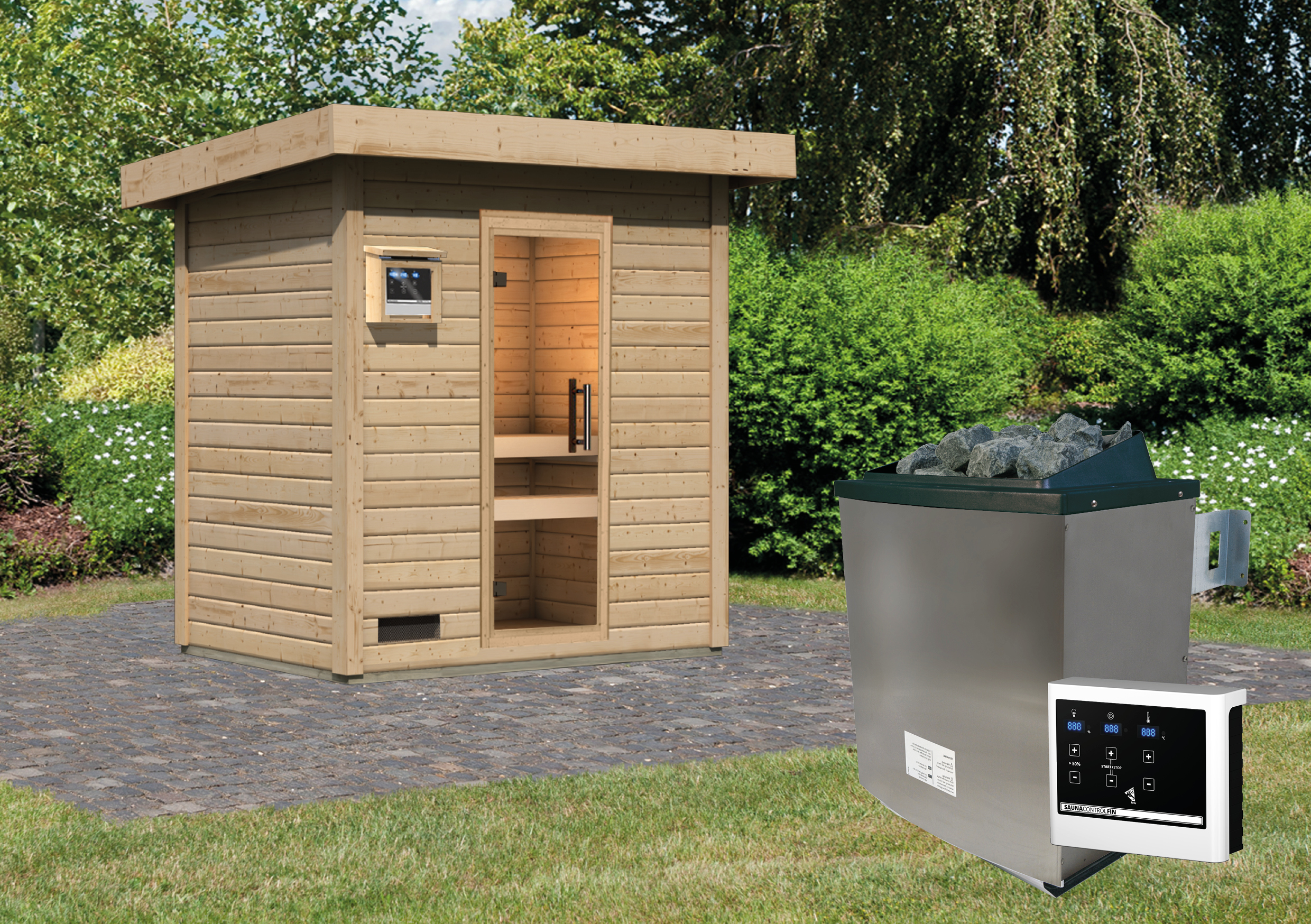Bidding from below pressure-impregnated floor beams and a solid wood floor with tongue and groove protection against rising moisture. Due to the compact and space-saving design, the Outdoor sauna Hytti 1 certainly also in your garden. Immerse yourself in a piece of Finnish culture and relax in your own outdoor sauna.