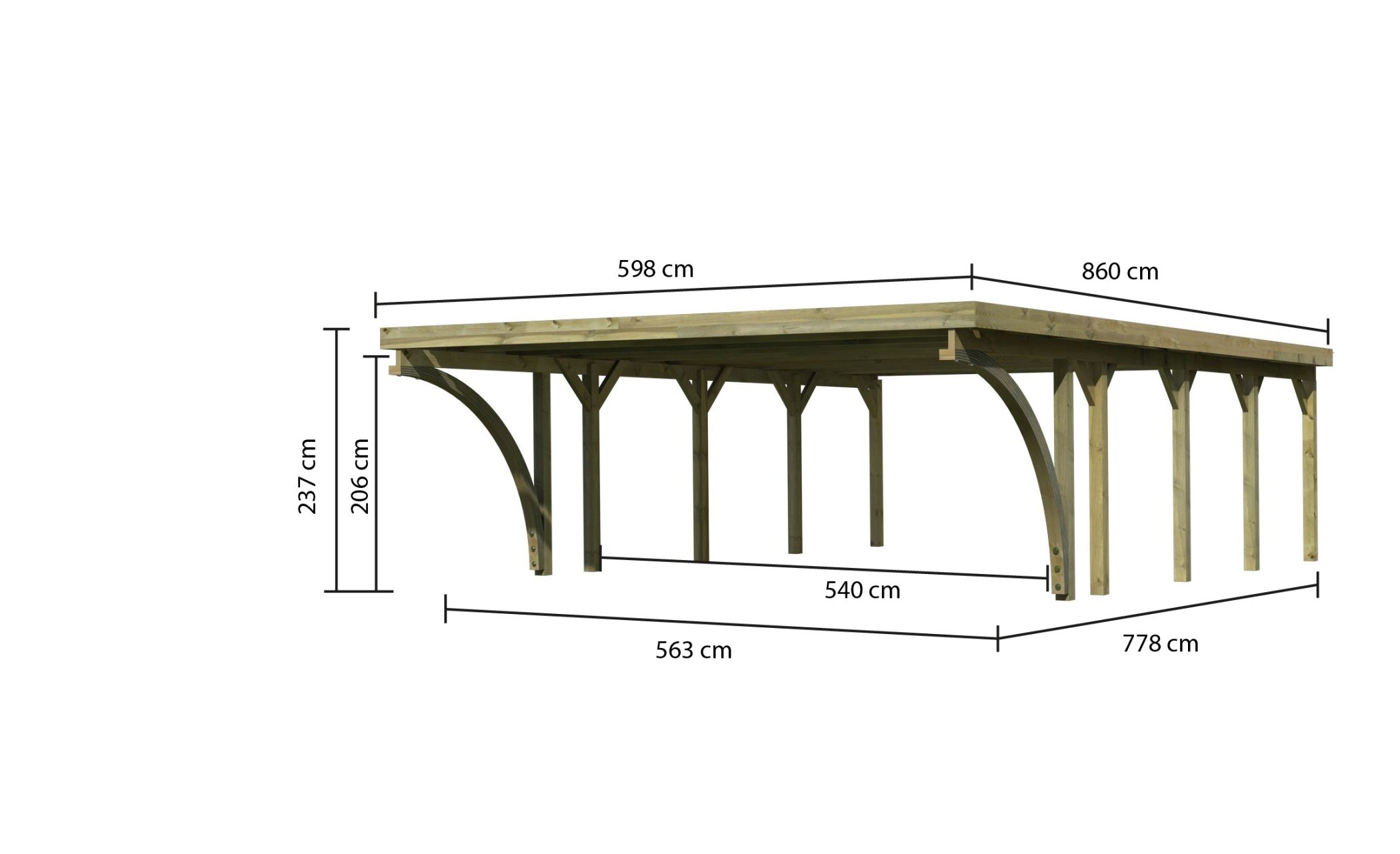 The Classic double carport convinces with its stable construction. The flat roof consists of either 0.8 mm thick PVC trapezoidal panels or 0.5 mm thick steel roof panels. Both roof variants are supplied with a hipped roof panel made of solid wood, which covers the unsightly edges of the roof panels. The construction is supported by 11.5 x 11.5 cm thick posts including cross connectors made of pressure-impregnated solid wood. Optionally, you can add one or two entrance arches to your carport and thus enhance it visually. Optionally available H-post anchors securely connect the solid wood posts to the ground. Design your carport according to your wishes. With an additionally available side or rear wall, you can shield your cars and thus protect them even more effectively from the side. Need extra storage space? This is also no problem with the Classic double carport. With an equipment room in two different models, you create additional space in your carport. Here you can store your garden tools, bicycles or garden furniture during the winter. With a total external dimension of 563 x 777.5 cm, the Classic double carport offers enough space for two cars. Create a protected place for your cars with the Double Carport Classic.