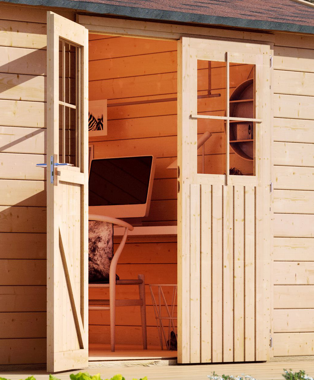 Passen Sie Ihr Gartenhaus Ihren Gegebenheiten an. Die Doppelflügeltür für Gartenhäuser mit einer Wandstärke von 38 mm hat ein Außenmaß von (BxH) 141 x 177 cm. Die Tür wird inklusive eines verleimten Türrahmens und einer Alu-Türschwelle geliefert. Verschlossen werden kann die Doppelflügeltür mithilfe eines Zylinderschlosses inklusive drei Schlüsseln. So können Sie Ihr Gartenhaus als Durchgang nutzen und es von zwei Seiten begehbar machen. Die Tür besitzt einen Lichtausschnitt je Türflügel aus Echtglas und ist in Naturbelassen erhätlich. Passen Sie Ihr Gartenhaus nach den eigenen Gegebenheiten an mit der Doppelflügeltür für 38 mm Wandstärke.