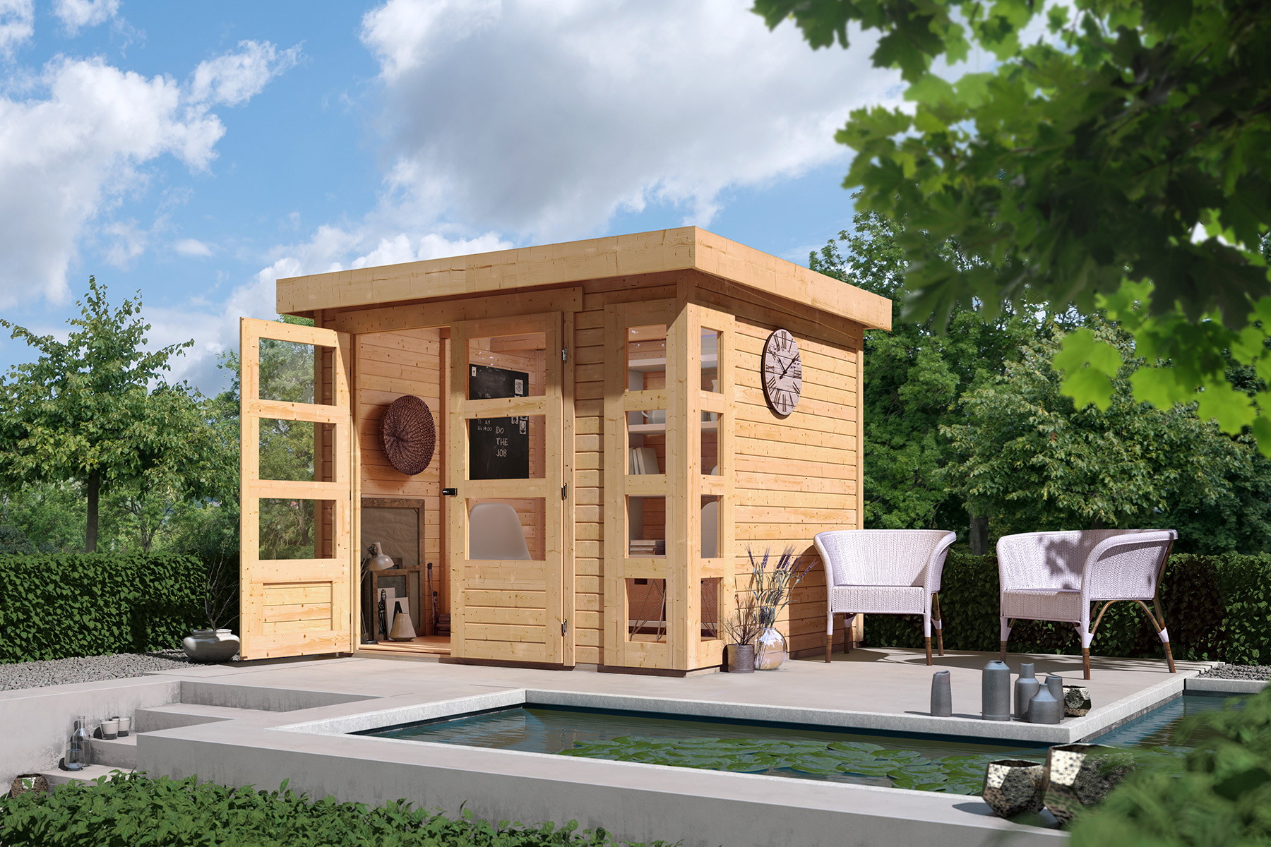 Even as a Pool a garden house from Karibu is recommended. On the one hand, a pool house can serve as a changing room near the pool and as a storage room for important pool accessories. On the other hand, a large wooden garden house next to the garden pool also offers the opportunity to relax wonderfully after swimming, sheltered from the wind and with a view of the water, just like on holiday.