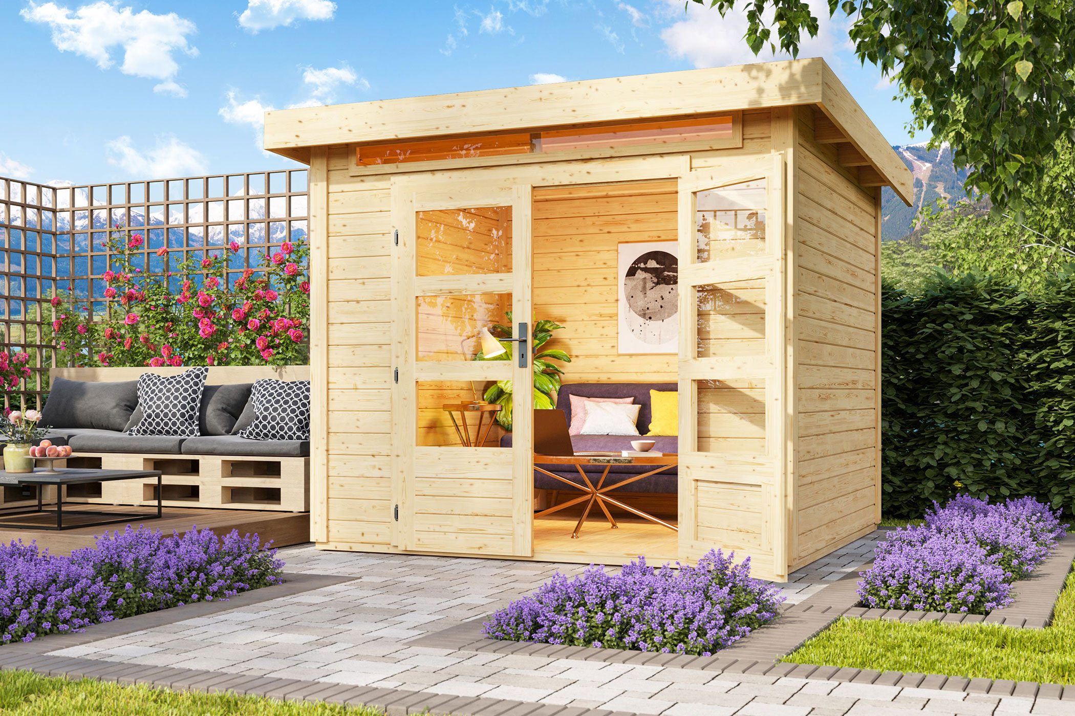 One Garden house with 2 rooms offers a particularly wide range of possible uses. For example, one room can be used as a hobby workshop and the other as a storage room for garden tools. Or a room can be designed as a living room and bedroom, while a wet room is installed in the adjoining room to turn your new garden house into a small holiday home.