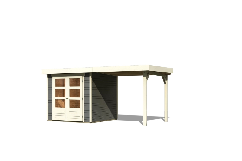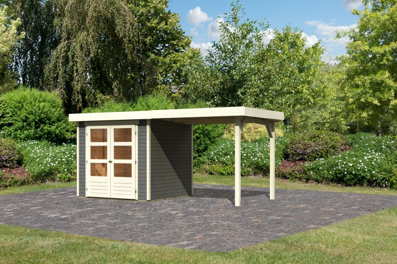 Karibu Gerätehaus “Askola 2” Flachdach mit Anbau/Terrasse modern aus Holz in Terragrau