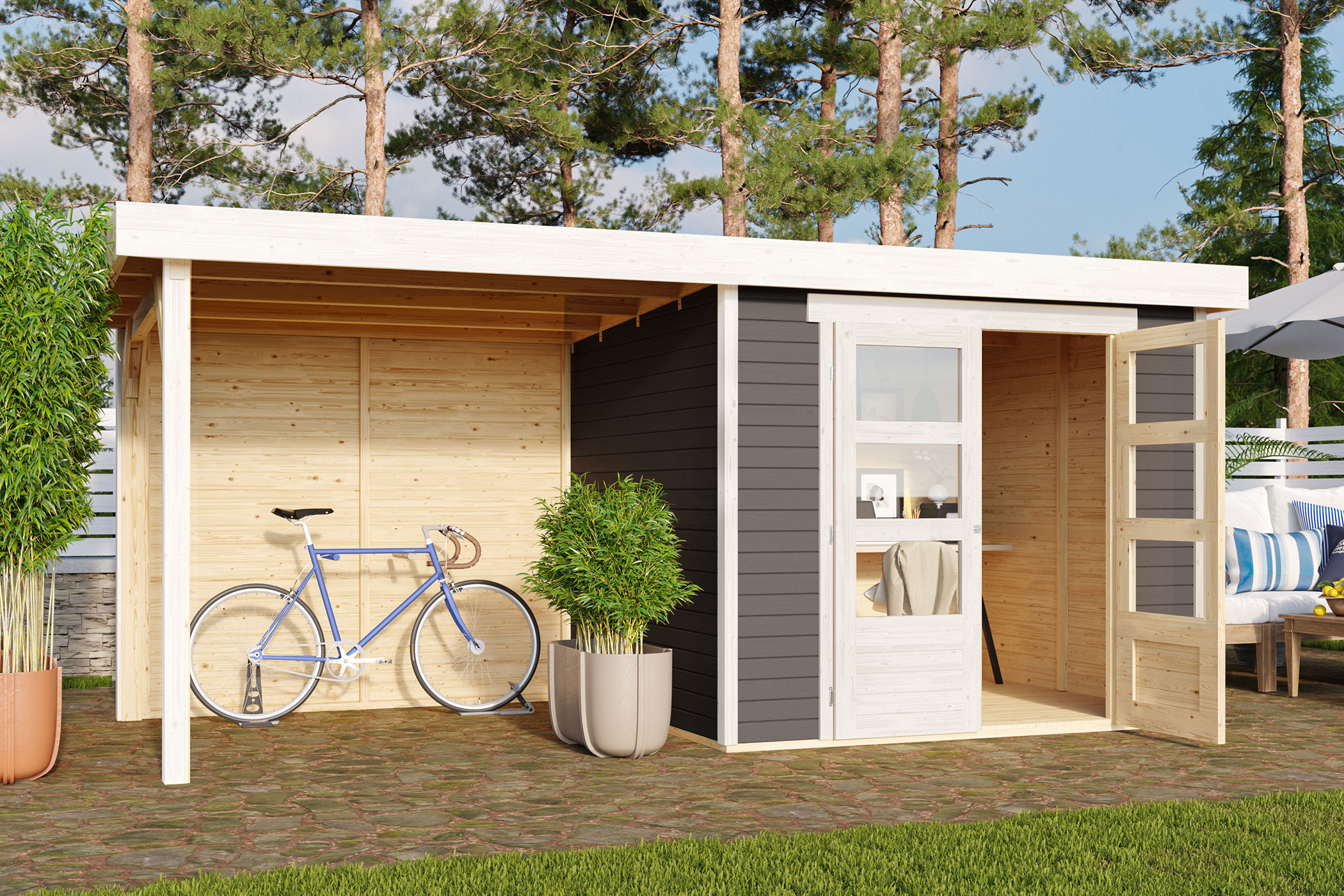 Karibu Gerätehaus “Askola 3” Flachdach mit Anbau/Terrasse modern aus Holz in Terragrau