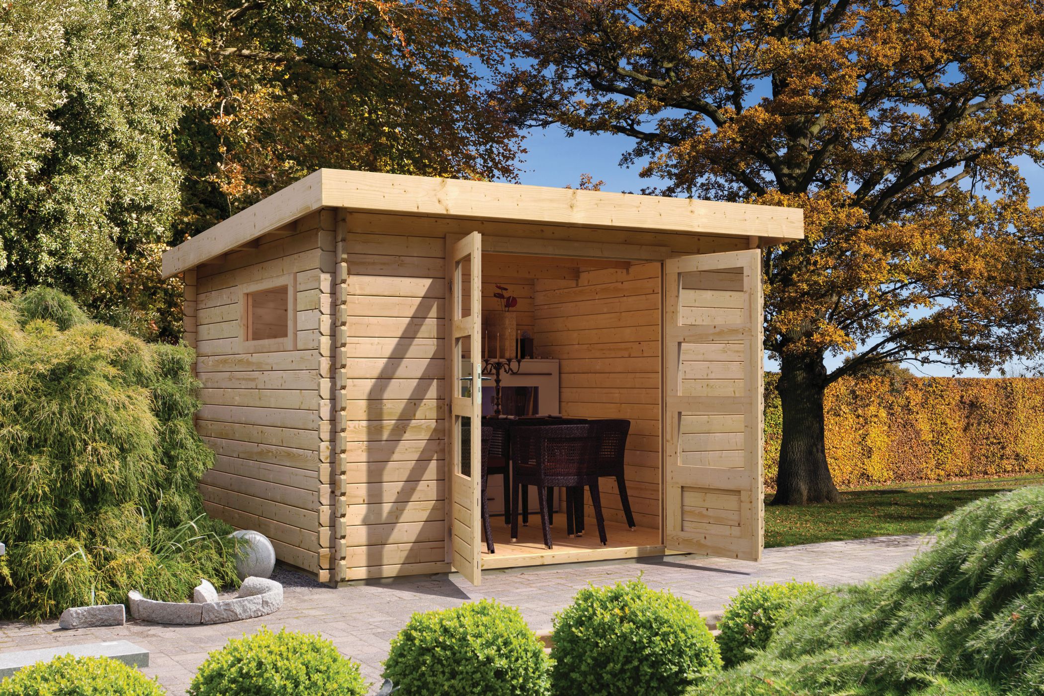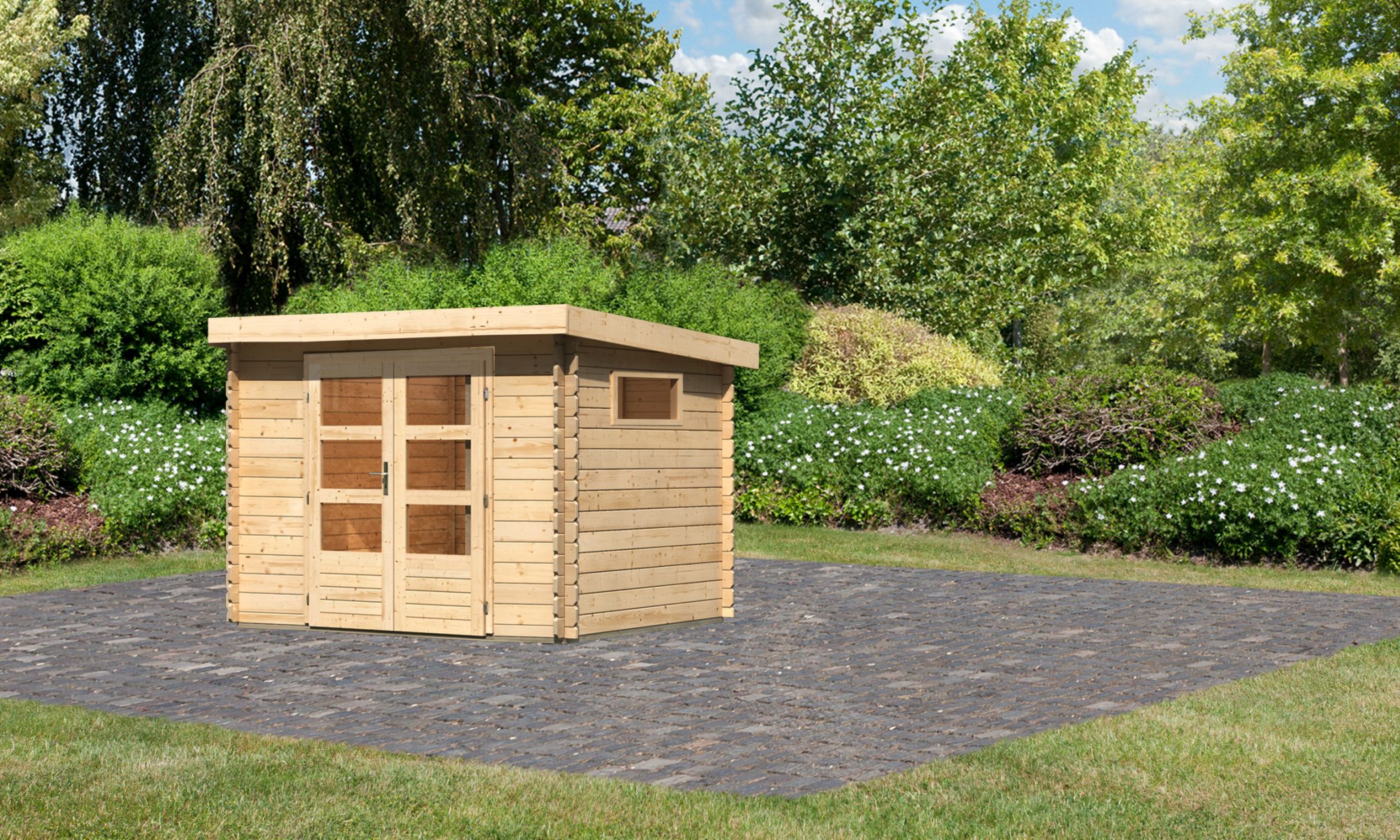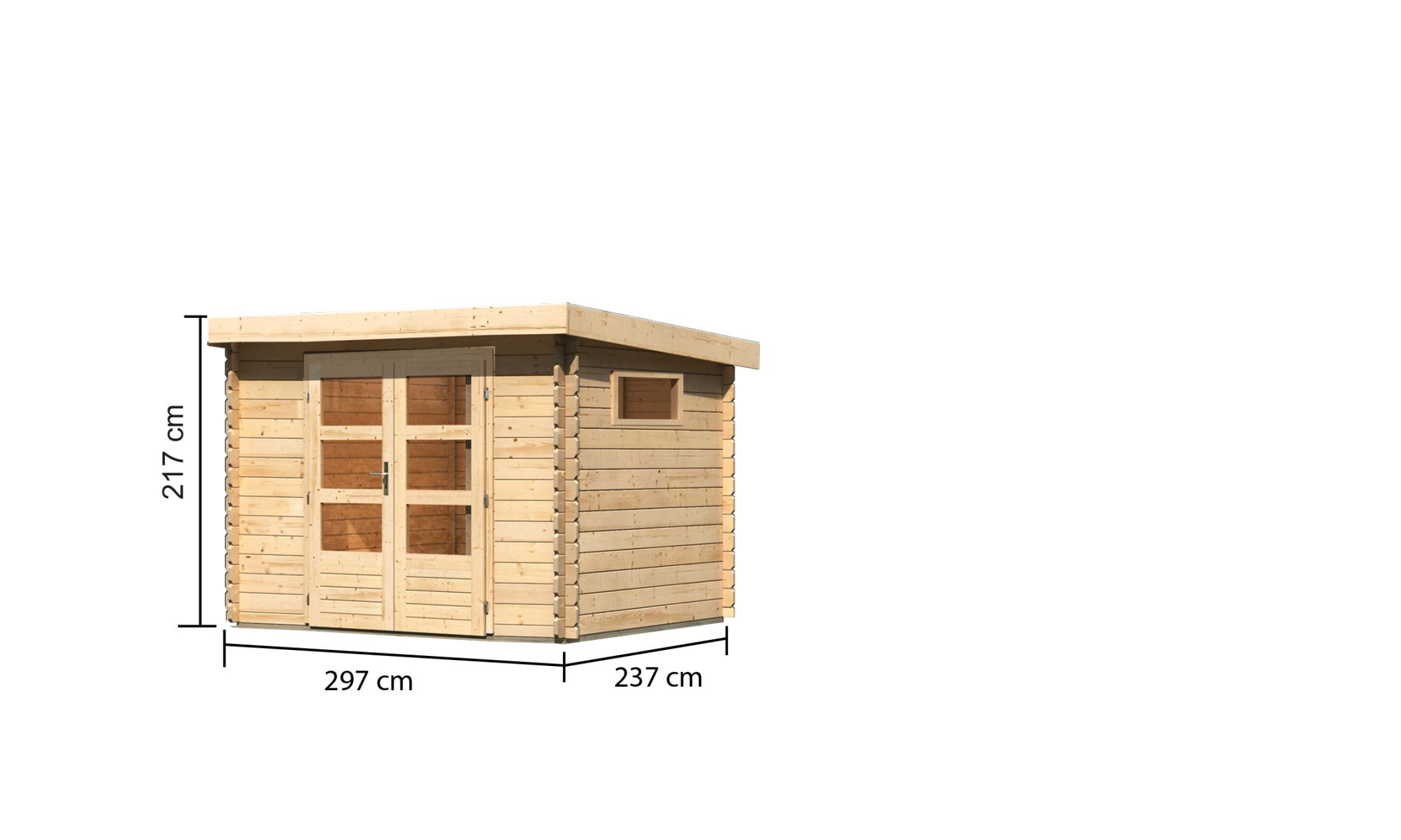 The modern log cabin with Shed roof . Das Benstrup 3 mit 28 mm starken Bohlen besteht aus nordischem Fichtenholz. Ein großer Vorteil dieser Serie ist die patentierte 6-Plus-Eckverbindung. Zusammen sorgt dies nicht nur für eine langlebige, stabile Konstruktion, sondern auch für ein robustes Gesamtbild. Das macht das Gartenhaus Benstrup mit einem Außenmaß von (BxT) 297 x 237 cm zu einem langen, treuen und festen Begleiter im eigenen Garten. Einmal aufgebaut und eingerichtet ist das Haus nicht mehr wegzudenken. In das Innere gelangen Sie durch eine großzügige Doppelflügeltür mit drei Lichtausschnitten je Türflügel. Gesichert wird das Haus mithilfe eines Zylinderschlosses in der Tür. Durch die Lichtausschnitte gelangt Tageslicht in den Innenbereich und lässt das Haus somit nicht nur von außen strahlen. Das Gartenhaus ist inNatural erhältlich und wird zusätzlich mit einem separatem feststehendem Fenster (Maße: 85 x 44 cm) zum selbsteinbau und einer self-adhesive roofing film geliefert. Dies lässt viel Platz für Ihre Gestaltungsideen. Verstauen Sie zum Beispiel Ihre Gartengeräte im Inneren des Häuschens, um Ihren Garten nach getaner Arbeit ordentlich zu hinterlassen oder nutzen Sie den Innenbereich zur Lagerung Ihrer Gartenmöbel im Winter. Bereichern Sie Ihren Garten mit dem modernen Blockbohlenhaus Benstrup 3.