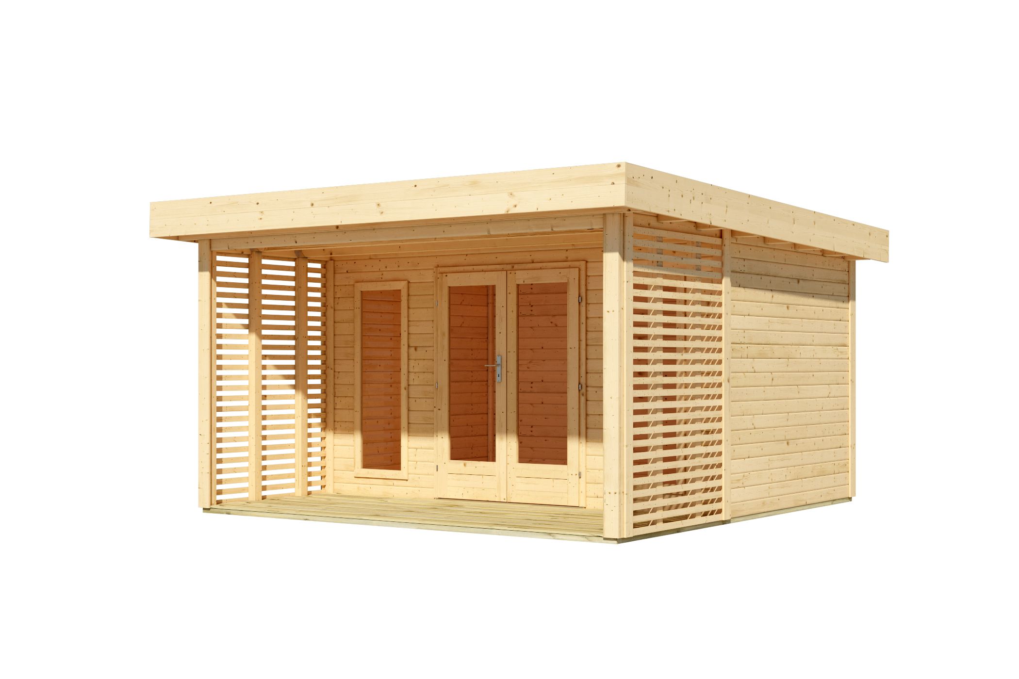 Lily has a particularly High snow load of 185 kg/m² and the necessary package for green roofs. With the Green roof the Lotus garden house still has a Snow load of 85 kg/m² . The garden house is made of 38 mm thick wall boards made of Nordic spruce in a plug-and-screw system and thus ensures a simple assembly and extremely Stable construction with double tongue and groove area of the wall boards. The monopitch roof is made of solid wood. The large 150cm deep terrace and the front roof overhang of 300 mm also effectively protects the entrance area. The floor area is 15.72 sqm with an enclosed space of 33.0 cbm. With a side height of 212 cm and a ridge height of 238 cm, the garden house offers optimal use of space. The garden house has a Base dimensions of 393 cm x 393 cm . Floor beams provide protection from below and are placed under the garden shed. The boiler pressure impregnation of the floor beams already protects them from the effects of the weather and wood-decomposing fungi. With its generous dimensions and solid wood frame, the practical and pre-assembled door ensures easy access to the garden shed and effectively secures the contents from unauthorized access. The glazing of the light cutouts ensures generous daylight.
