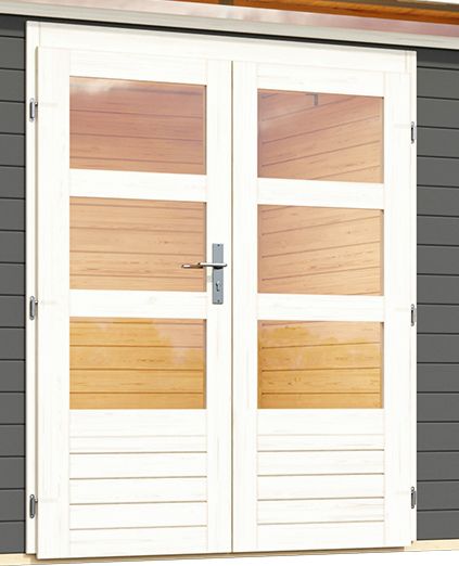The Trelleborg F garden house is entered through a modern double wing door with 6 light cut-outs made of art glass. With a Cylinder lock and 3 keys, the garden house is locked. In addition, the Trelleborg F garden shed can be supplemented with an extension roof with a width of 3.20 m.