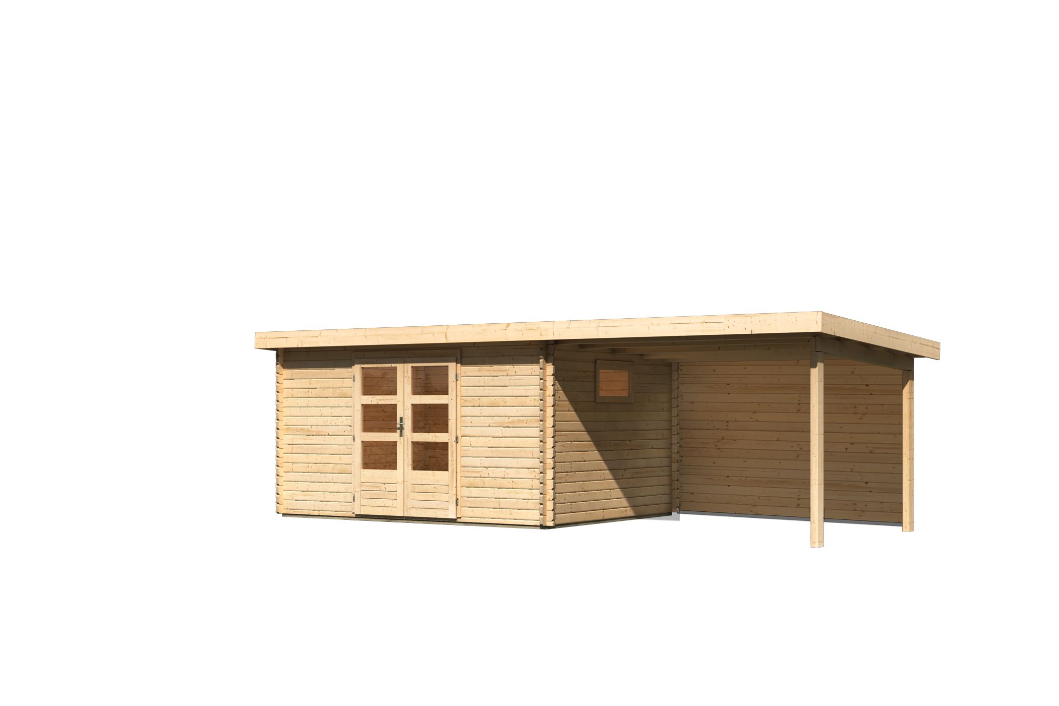 Karibu Gartenhaus “Trittau 5” Pultdach zum Wohnen mit Anbau/Terrasse aus Holz in Natur