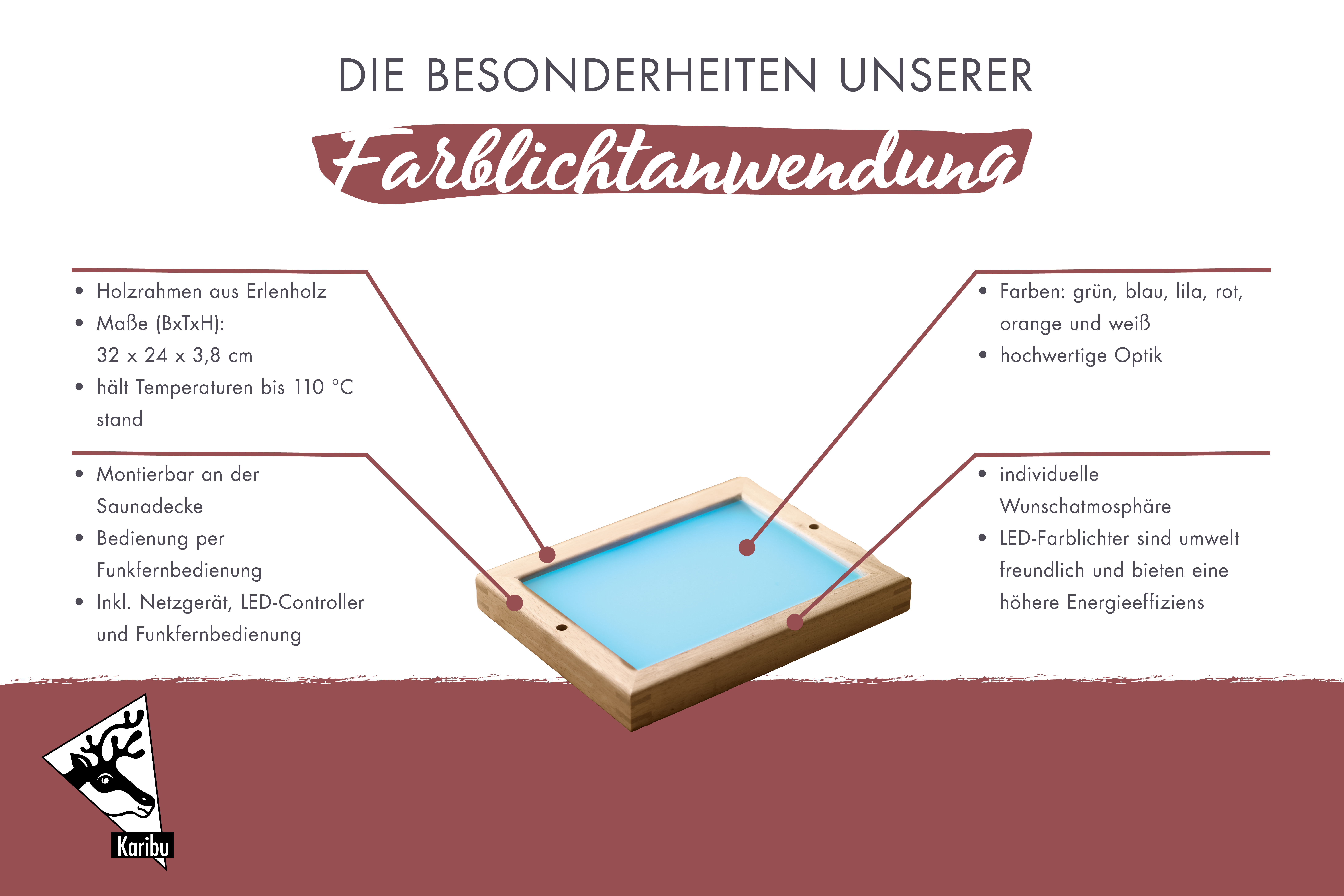 Für ein bisschen Abwechslung der Farbenwelt in Ihrer Saunakabine sorgt das LED Farblicht. Dieses besteht aus einem Holzrahmen aus Erlenholz, wodurch es eine hochwertige Optik erhält. So können Sie mithilfe einer Funkfernbedienung ganz einfach Ihre Lieblingsfarbe einstellen oder einen Farbverlauf kreieren. Egal ob grün, blau, lila, rot, orange oder weiß, bei dem LED Farblich ist für jede Stimmung die passende Farbe dabei. So kann die Farbe Gelb sich positiv auf die Stimmung auswirken und eine gute Laune fördern. Für eine beruhigende Stimmung sorgen die Farben Grün und Blau. Das Farblicht kann sowohl an der Decke als auch an der Wand montiert werden. So können Sie die Montage individuell auf Ihre Bedürfnisse einstellen und es an dem Wunschort anbringen. Im Lieferumfang enthalten sind die LED-Lampe, ein Netzgerät, ein LED-Controller und die Funk-Fernbedienung. Bitte nehmen Sie die Fernbedienung nicht mit in die Saunakabine. Geeignet ist das LED Farblicht für Temperaturen bis 110°C und einer Raumfläche von bis zu 6m². Mit Abmessungen von (BxTxH) 32x24x3,8cm besitzt sie die ideale Größe um Ihre Sauna vollständig auszuleuchten. Schaffen Sie sich Ihre Wunschatmosphäre mit den vielen Farbeinstellungen des LED Farblichts.