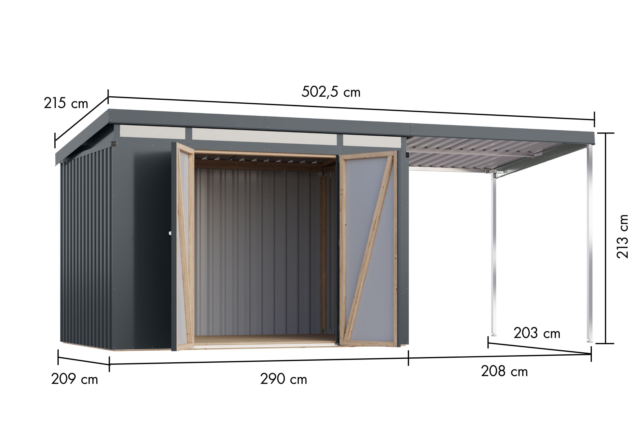 Karibu Gerätehaus aus Metall “Iridium 3” Pultdach mit Anbau/Terrasse in Anthrazit
