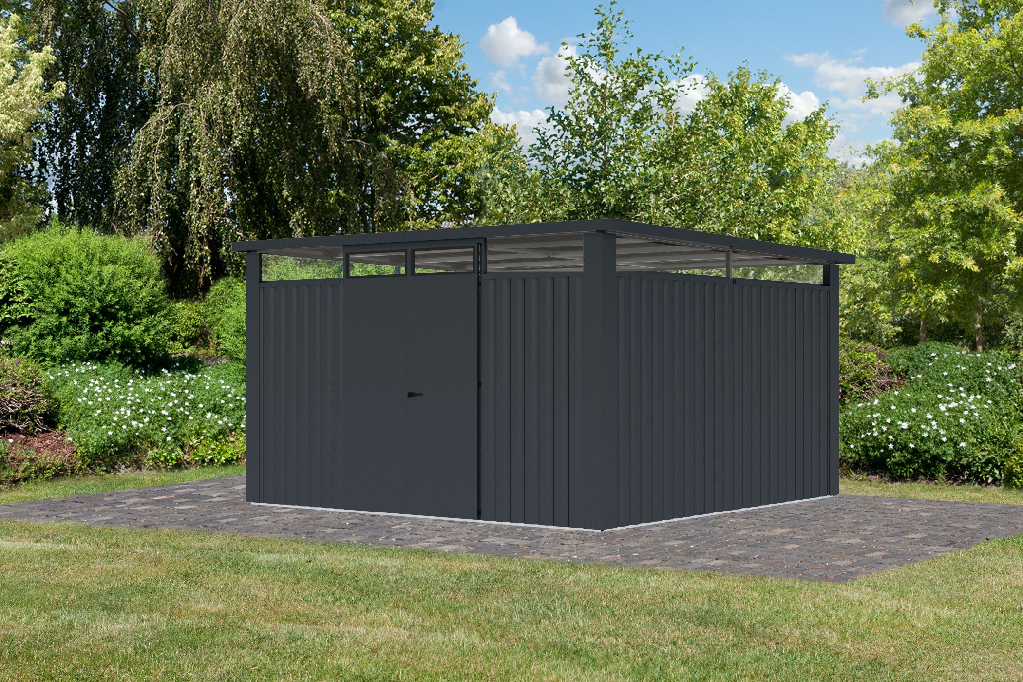 - Skylight: Durch das umlaufende Lichtband aus Kunstglas unter dem Dach sowie in der Tür gelangt sehr viel Tageslicht ins Innere Ihres neuen Metall-Gartenhauses von Karibu.