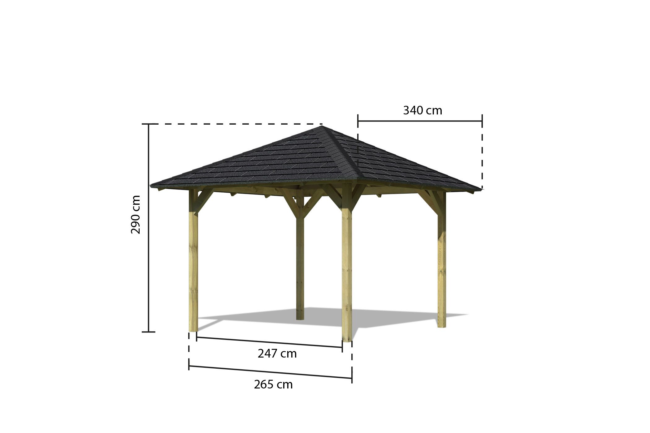 Verkleidet mit den Dachschindeln können Sie dem Pavillon den letzten Schliff verleihen und ein Highlight in Ihrem Garten setzen. Auf die Spitze des 12,8 m² großen Daches rundet eine optional erhältliche Pavillonhaube das Gesamtbild ab. Die Grundfläche von 7 m² bietet Ihnen ausreichend Platz für eine gemütliche Ess- oder Sitzgruppe. Ein angenehmer Stand ist bei einer Firsthöhe von 290 cm ebenfalls möglich. Genießen Sie Ihren Garten in vollen Zügen mit dem Pavillon Sevilla.