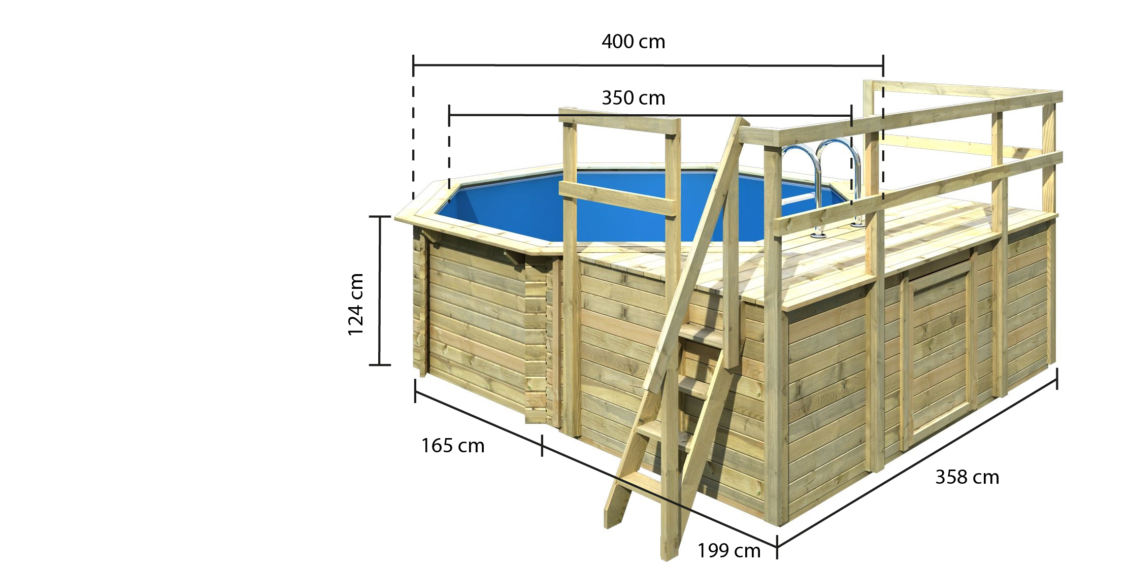 Durch seine großzügigen Maße von 400 x 400 cm bietet der Pool Spiel und Spaß für die ganze Familie. Der Achteckpool fasst ca. 11300 Liter und hat eine Wassertiefe von max. 111 cm. Eine Holzleiter aus nordischer Fichte und eine Edelstahlleiter erleichtern Ihnen den Einstieg in das kühle Nass. Die Konstruktion besteht aus 38 mm kesseldruckimprägnierten Bohlen und wird in klassischer Blockbohlenbauweise montiert. Um sich nach dem Plantschen zu erholen, können Sie Ihren Pool wahlweise durch eine Terrasse erweitern. In den fünf Varianten, die sich in der Größe unterscheiden, ist bestimmt auch die Richtige für Ihren Pool dabei. Ausgestattet mit einem Liegestuhl eignet sich die Terrasse ideal, um die Sommersonne zu genießen. Ein kühler Drink und ein gutes Buch machen die Entspannung perfekt. Die im Lieferumfang enthaltenen 0,6mm starke PVC-Folie in blau schützt das Holz vor dem Wasser und ermöglichen ein angenehmes Gefühl unter Ihren Füßen. Das kesseldruckimprägnierte Holz ist durch die spezielle Behandlung besonders widerstandsfähig gegen die Witterung und verspricht Ihnen somit viel Spaß, Spiel und Entspannung. Verschönern Sie sich den Sommer und gönnen Sie sich eine kühle Auszeit mit dem Achteckpool Modell 1 , der bestimmt auch bald in Ihrem Garten steht.